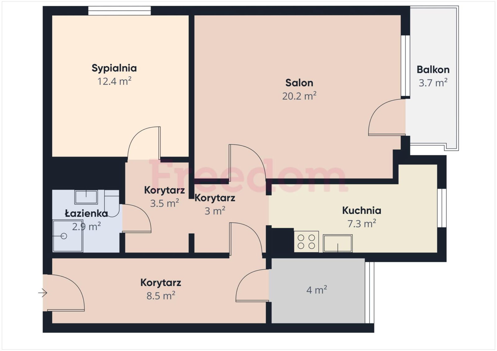 - Powierzchnie pokoi: 20,2+12,4+4