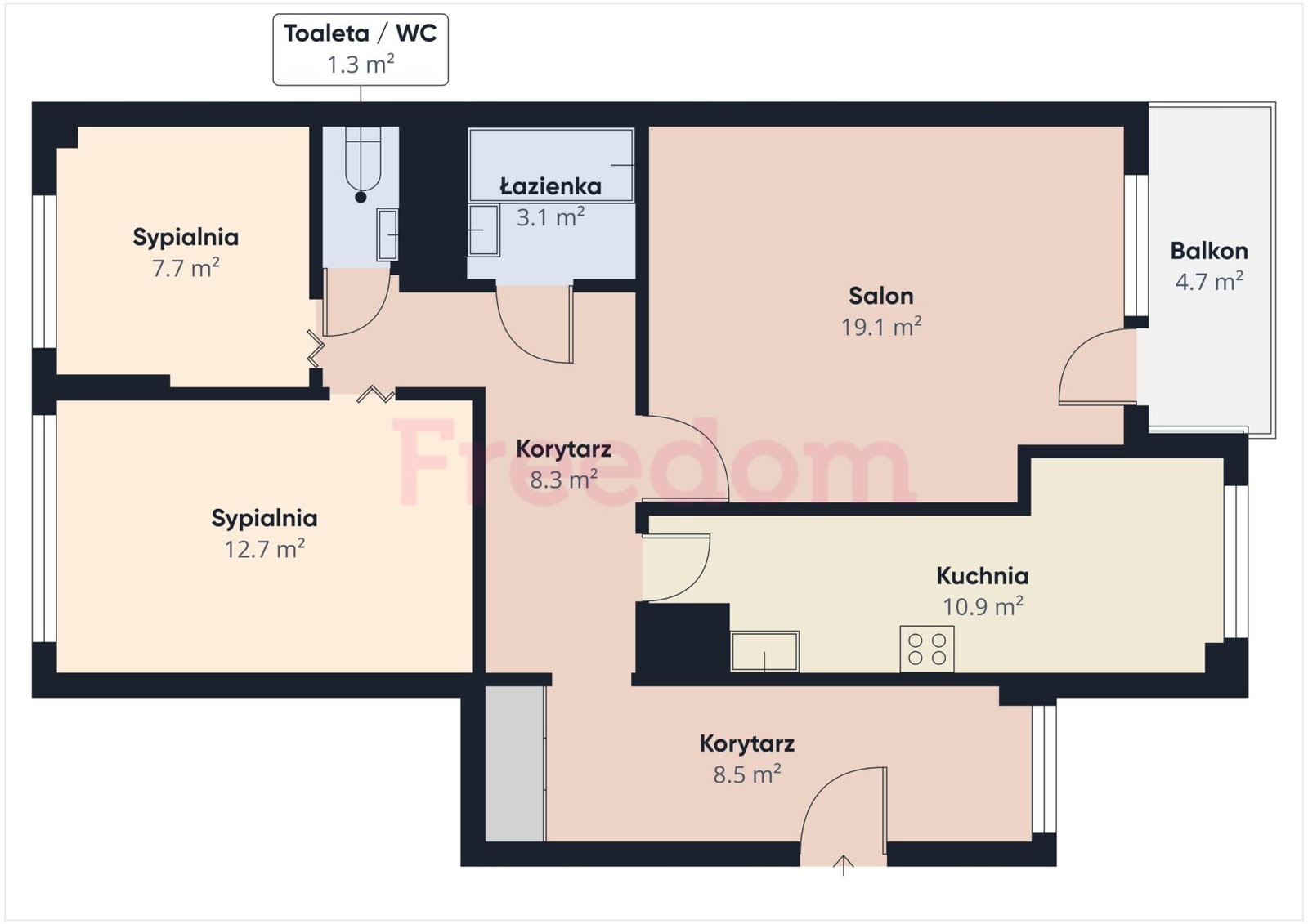 - Powierzchnie pokoi: 19,1+12,7+7,7