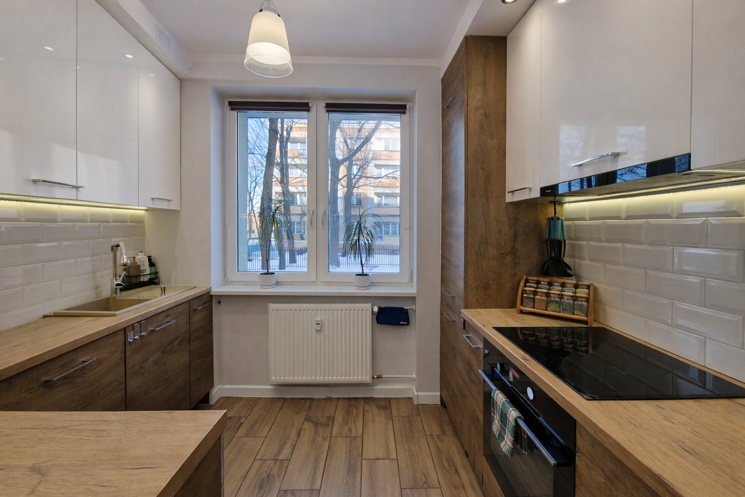 Kuchnia - oddzielna z lodówką, zmywarką, płytą indukcyjną oraz piekarnikiem, okapem i pralką