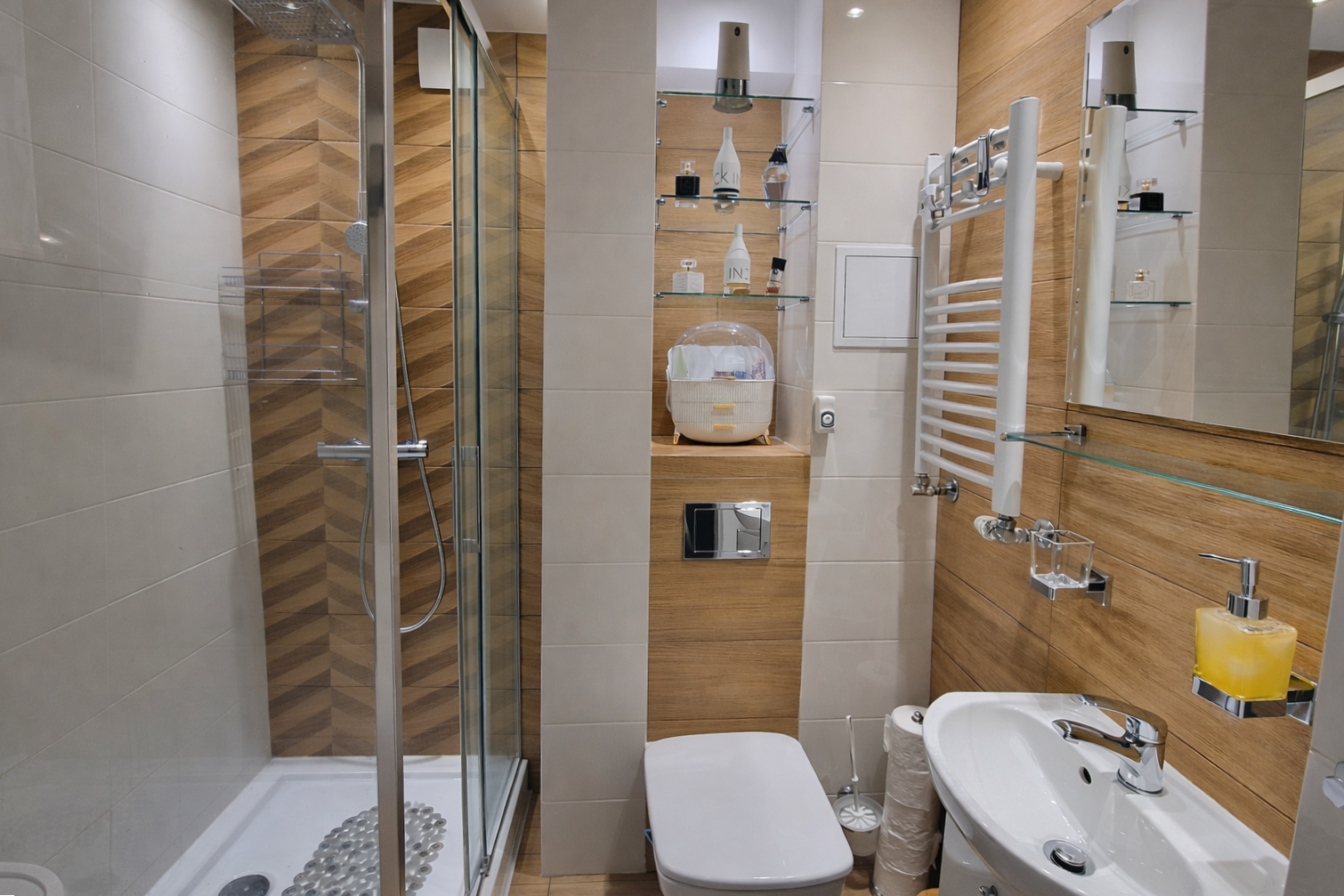 Łazienka - z prysznicem ( przy remoncie zmieniono wannę na prysznic), półki w zabudowie, podwieszane wc