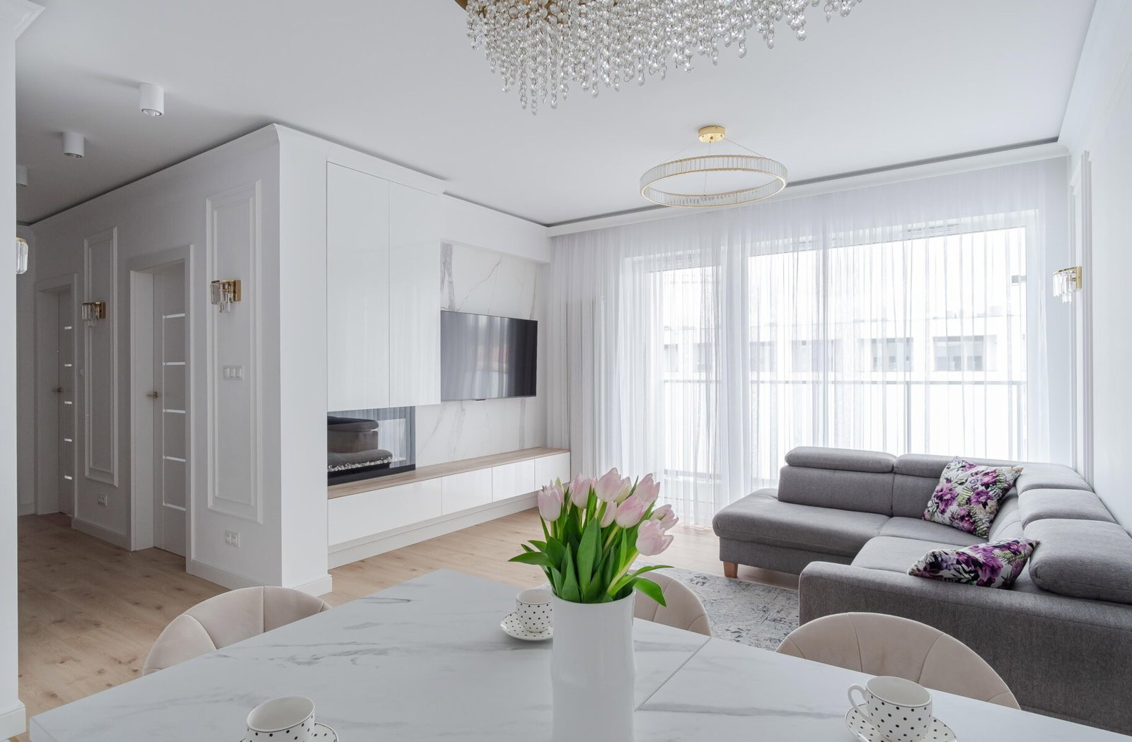 Mieszkanie w całości zaaranżowane i wykończone według indywidualnego projektu: jasne kolory, stylowe sztukaterie, złote dodatki, kryształowe oświetlenie oraz gustowne meble to unikatowe cechy tego wnętrza.