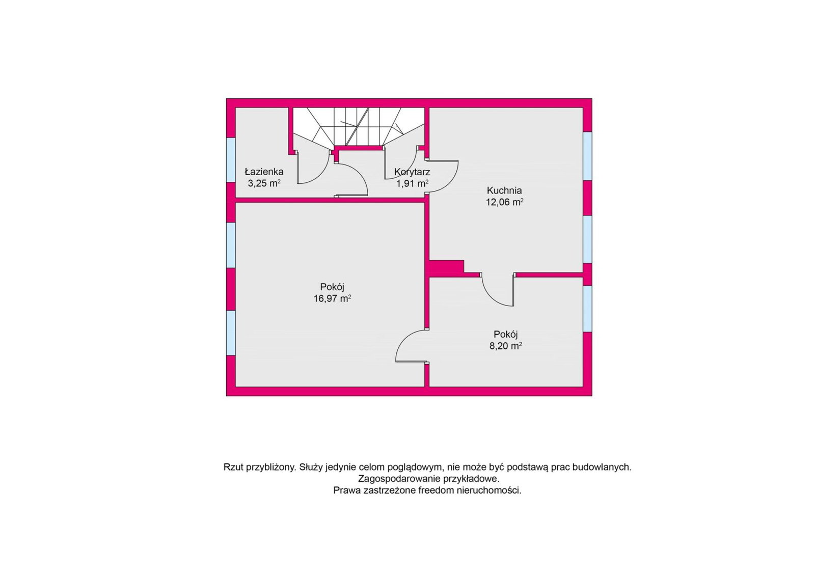 Wejście do budynku jest wspólne dla dwóch rodzin. Mieszkanie znajdujące się na piętrze i składa się z przedpokoju, łazienki z wc, widnej kuchni z której to przechodzi się do pokoju dziennego i dalej do sypialni.