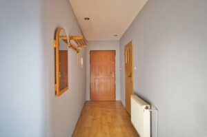 Dwu pokojowe mieszkanie o pow. 50,3 m2 na pierwszym piętrze ma ciekawy a zarazem przestrzenny układ który przyszły właściciel może zaprojektować jako jedną całość tworząc tym samym przestrzenny pokój z aneksem kuchennym.