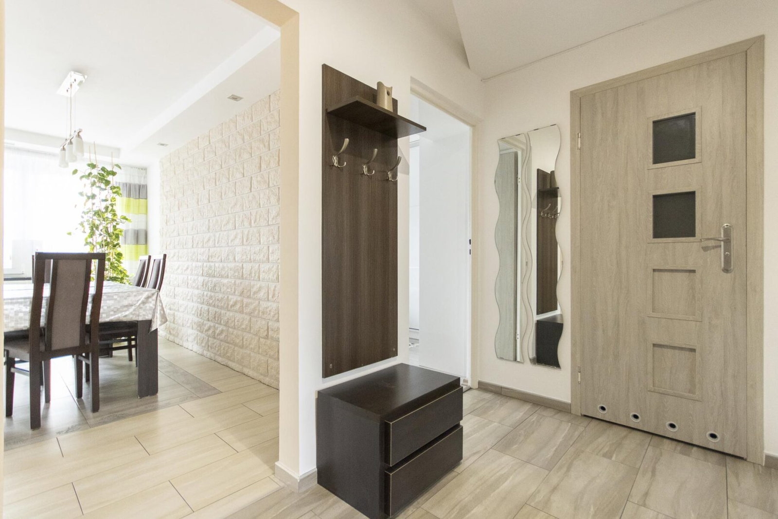 - Podłogi w pomieszczeniach: Płytki, Panele