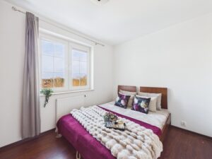 Mieszkanie sprzedawane jest z wyposażeniem, w tym zabudowanymi szafami, zabudową kuchenną, piekarnikiem, płytą indukcyjną, zmywarką, lodówką, łóżkami oraz kanapą, więc nie musisz dokupywać dodatkowych mebli.
