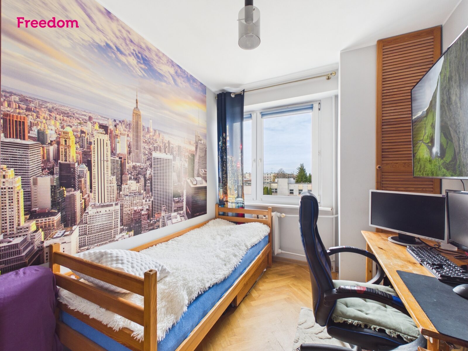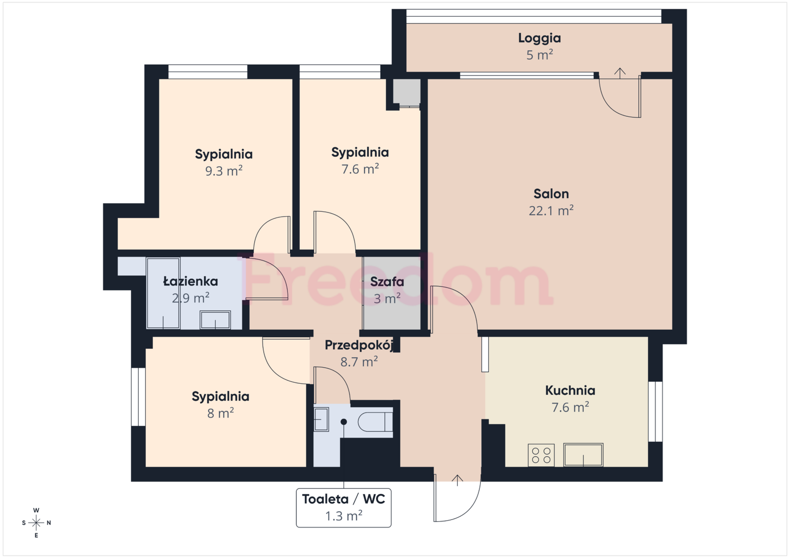 Wnętrze zachwyca światłem – ekspozycja na północ, południe i zachód sprawia, że mieszkanie jest bardzo jasne przez cały dzień. Cztery ustawne pokoje dają swobodę aranżacji: komfortowa strefa dzienna z wyjściem na dużą loggię z widokiem, sypialnia z miejscem na garderobę za ścianką, dodatkowa szafa w zabudowie oraz dwa kolejne pokoje – idealne dla dzieci, jako gabinet lub pracownia.