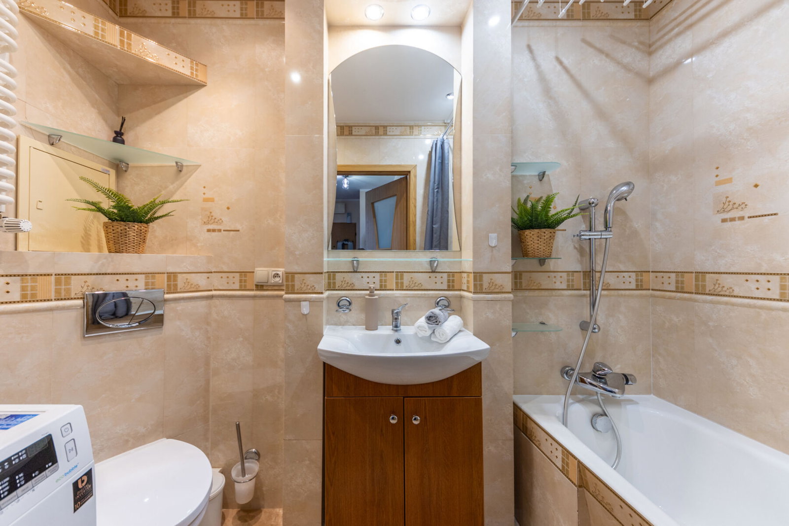 Mieszkanie ma dwa pokoje, w tym salon z wydzieloną strefą sypialnianą, co daje niemal trzeci pokój. Dodatkowo znajduje się oddzielna kuchnia oraz łazienka z wanną.
