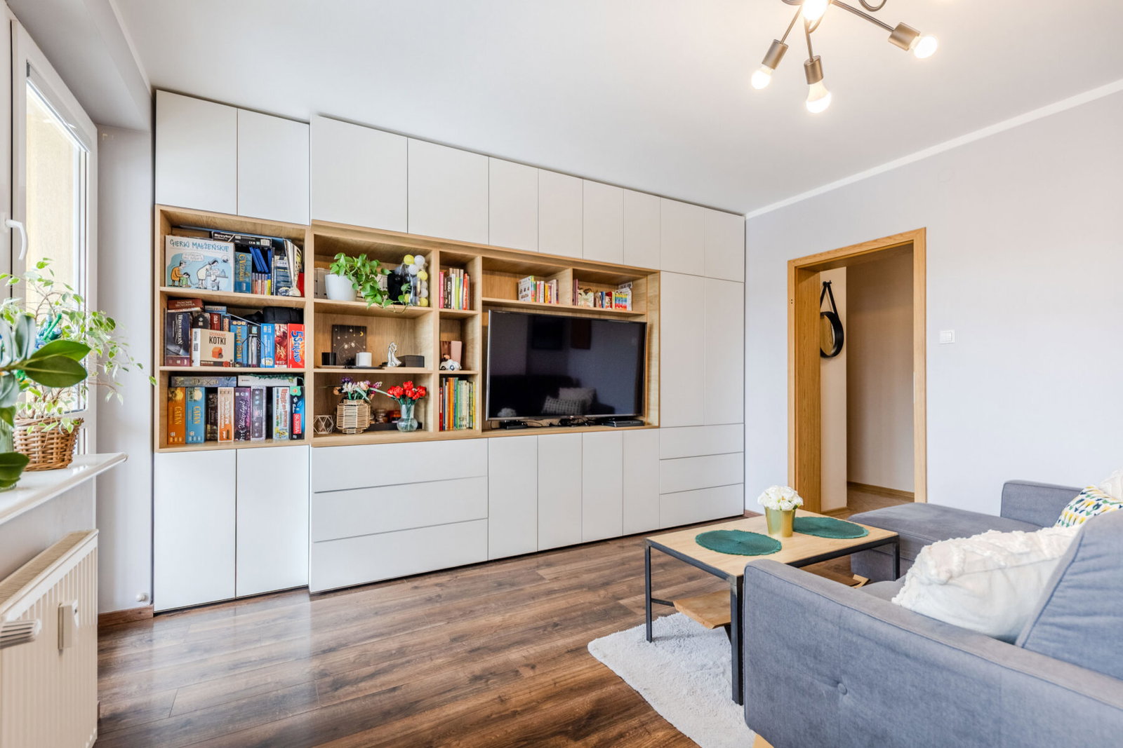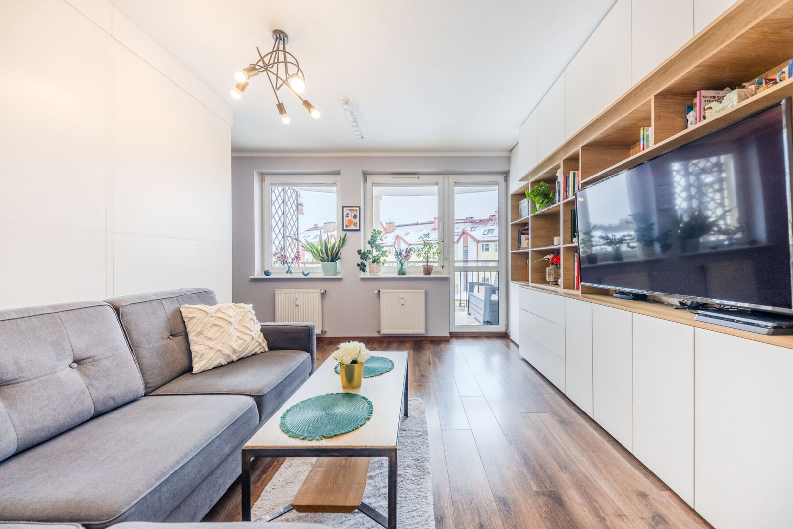 Oferuję na sprzedaż funkcjonalne 2-pokojowe mieszkanie gotowe do wprowadzenia z przemyślaną zabudową w salonie, w którym również wydzielono dodatkową strefę sypialnianą – rozwiązanie, które zapewnia niemal trzeci pokój. Takie pomysłowe i komfortowe aranżacje zdarzają się naprawdę rzadko.