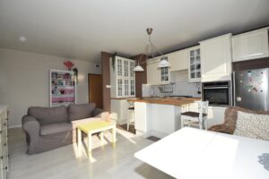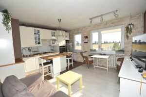 - Przestronnego salonu połączonego z kuchnią wyposażoną w sprzęt AGD