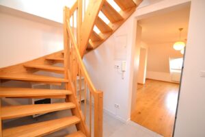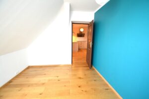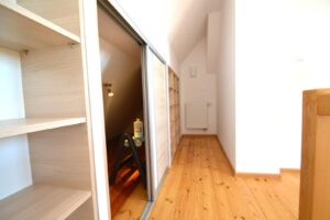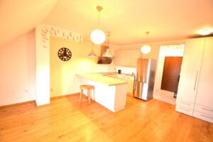 Mieszkanie jest w dobrym stanie. Na pierwszej kondygnacji podłogi wyłożone są deską barlinecką, a kuchnia jest w pełni wyposażona w zabudowę i sprzęty AGD. Łazienka jest wykafelkowana, a na antresoli znajdują się okna firmy Fakro z roletami zewnętrznymi.