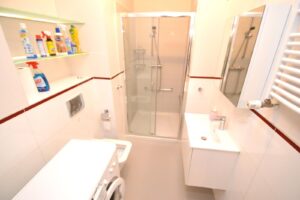 Na pierwszej kondygnacji w pokojach znajduje się deska barlinecka, pełna zabudowa kuchenna wraz ze sprzętami AGD, łazienka wykafelkowana.