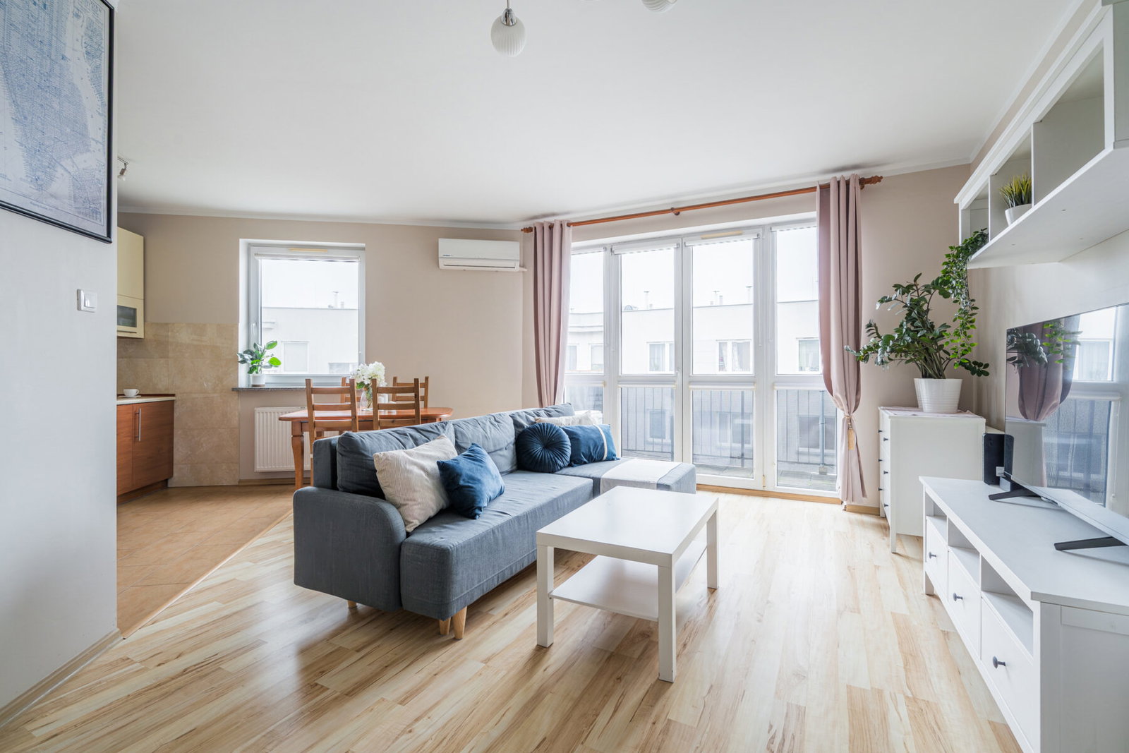 - salonu z klimatyzacją, otwartego na jadalnię i jasną kuchnię,