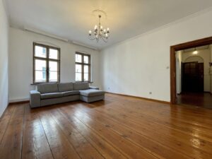 Odrestaurowane oryginalne drzwi wewnętrzne, drewniane panele na podłodze, mieszkanie częściowo umeblowane.