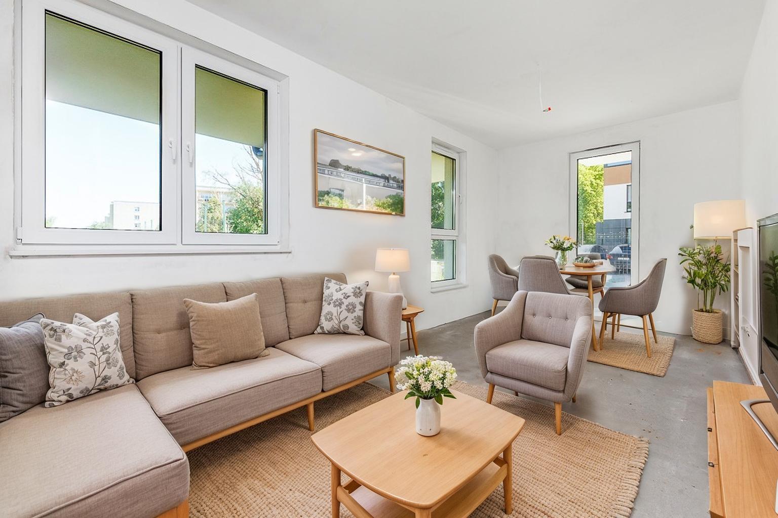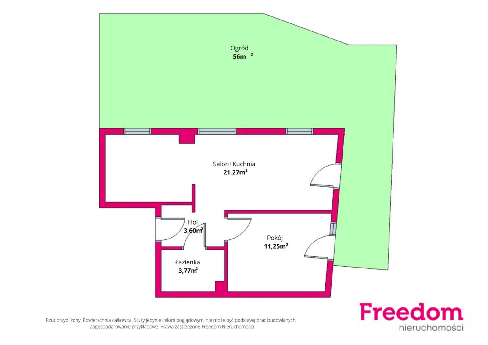 Mieszkanie ma powierzchnię 39,89 m² i składa się z dwóch pokoi. Salon z aneksem kuchennym ma 21,27 m² i bezpośrednie wyjście na ogród o powierzchni 56 m². Drugi pokój, pełniący funkcję sypialni, ma 11,25 m² i również posiada wyjście na ogród. Dodatkowo, w mieszkaniu znajduje się łazienka o powierzchni 3,77 m² oraz przedpokój o powierzchni 3,60 m².