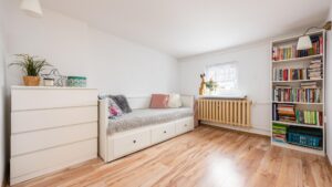 W sypialni łóżko rozkładane oraz komoda z szufladami.