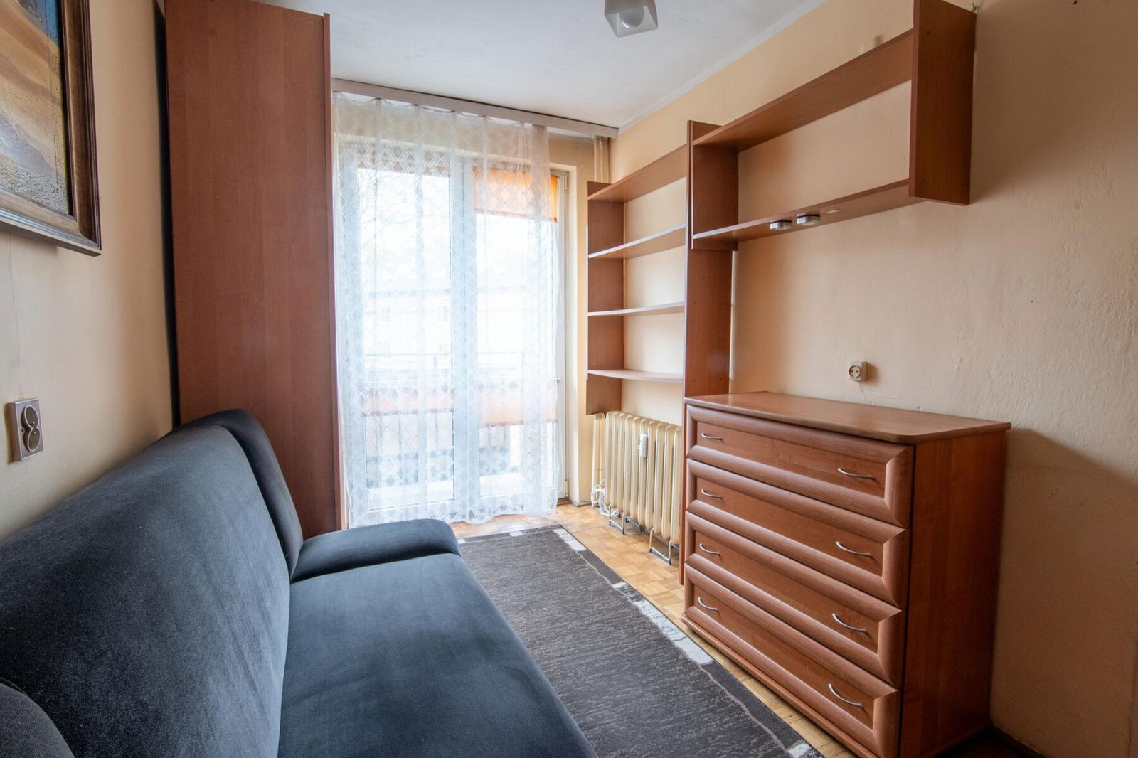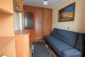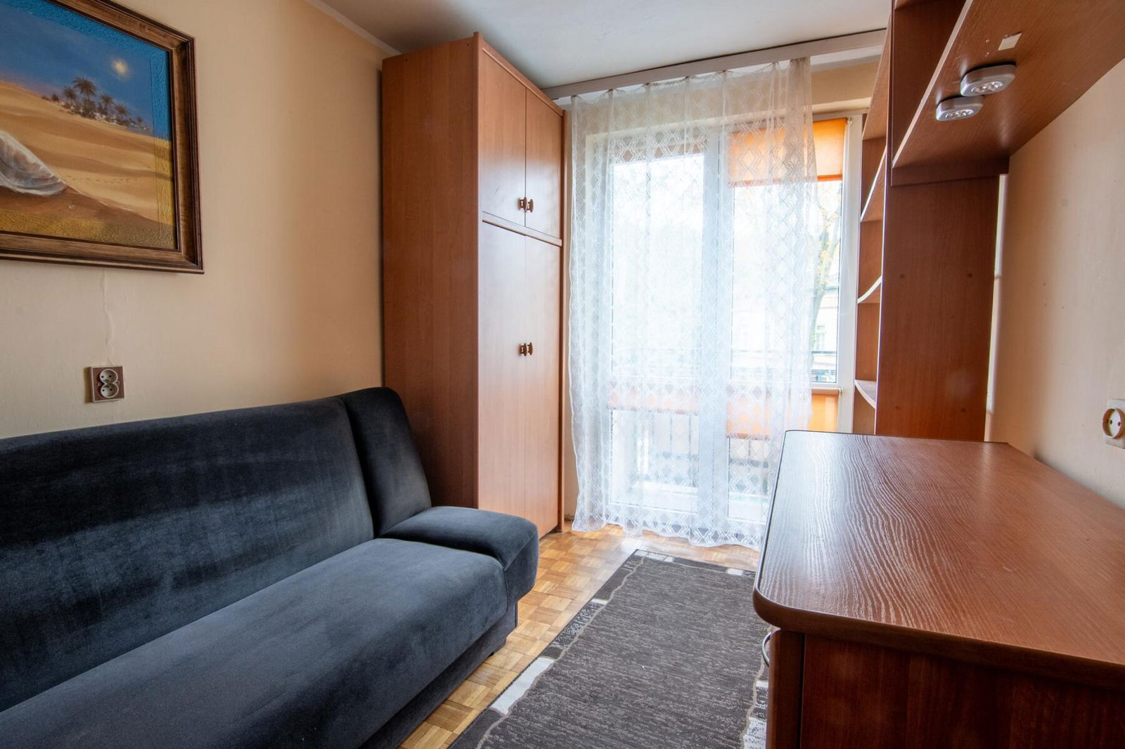 Tuż za pokojem dziennym został wydzielony pokój z wyjściem na balkon. Znajduje się w nim rozkładane łóżko, biurko z krzesłem, liczne szafki i duża szafa. Jest to pomieszczenie, w którym może służyć jako sypialnia.