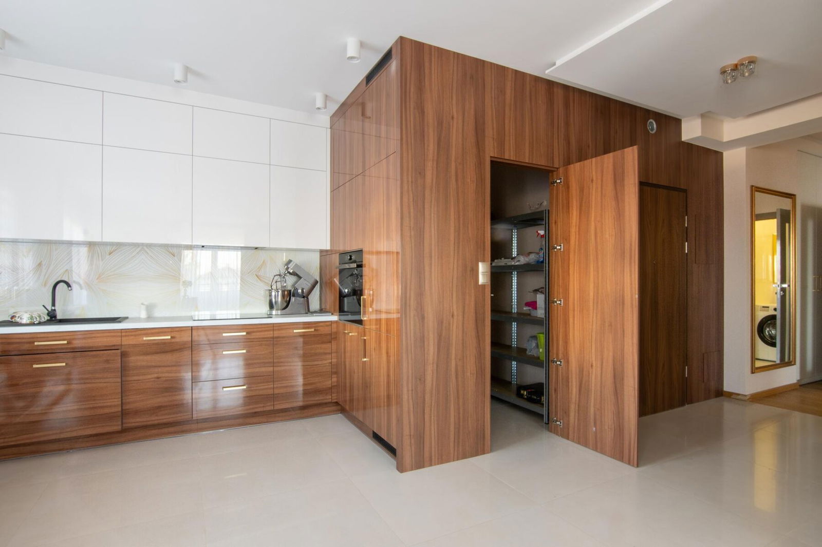 Duży przestronny przedpokój w kształcie litery "L" mieści dwie podświetlane, funkcjonalne szafy.