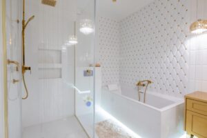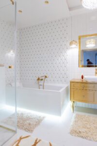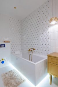 Łazienka to prawdziwa strefa relaksu- elegancka, wyposażona zarówno w dużą wannę jak i przestronny prysznic.