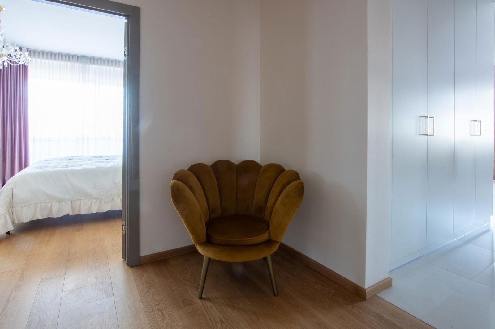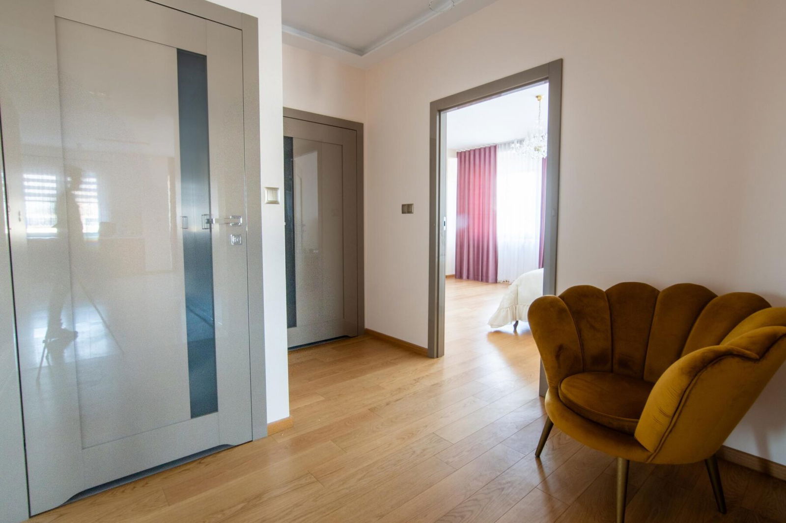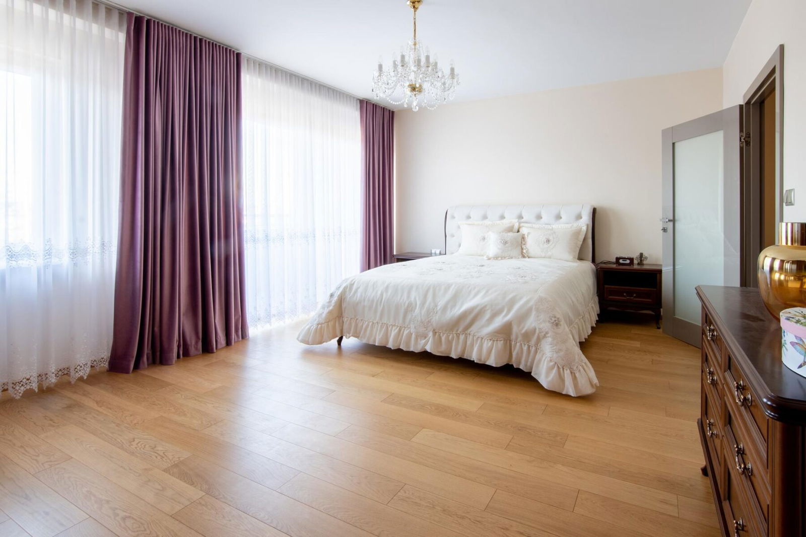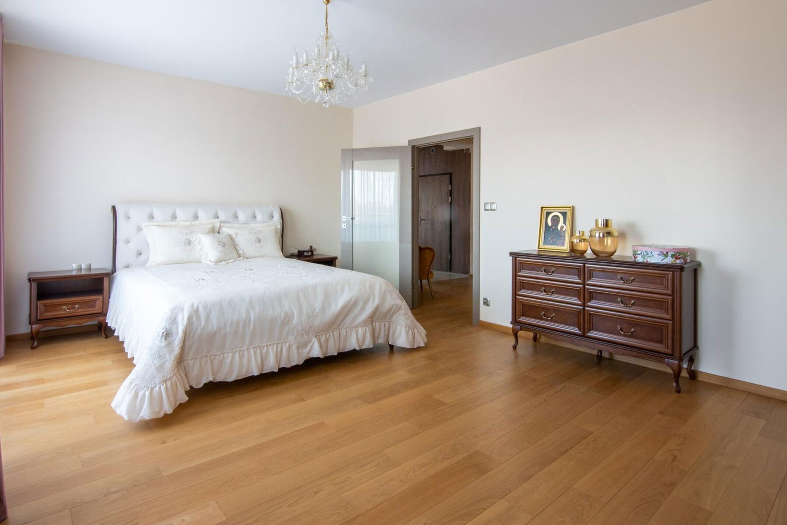 Drewniana podłoga w salonie i sypialni wykonana z litego drewna dębowego podkreśla elegancję wnętrza, a starannie dobrane detale tworzą spójną i luksusową całość