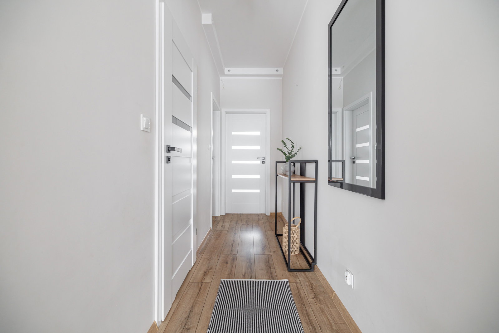 - Podłogi w pomieszczeniach: Panele, Płytki