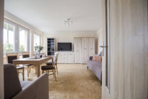 - Przestronnego salonu z dwoma oknami i balkonem, który może pełnić funkcję strefy dziennej i jadalnianej,