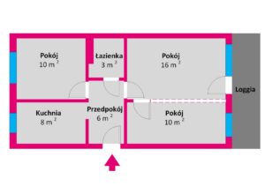 Dwa pokoje z loggią ponad 5 m² – to mieszkanie, które zaskakuje funkcjonalnością. Jeśli szukasz przestrzeni z dodatkowym miejscem do pracy, relaksu lub dla dziecka, właśnie ją znalazłeś. Układ mieszkania daje komfort codziennego życia. W dużym pokoju został wydzielony trzeci pokój, co widać na rzucie.