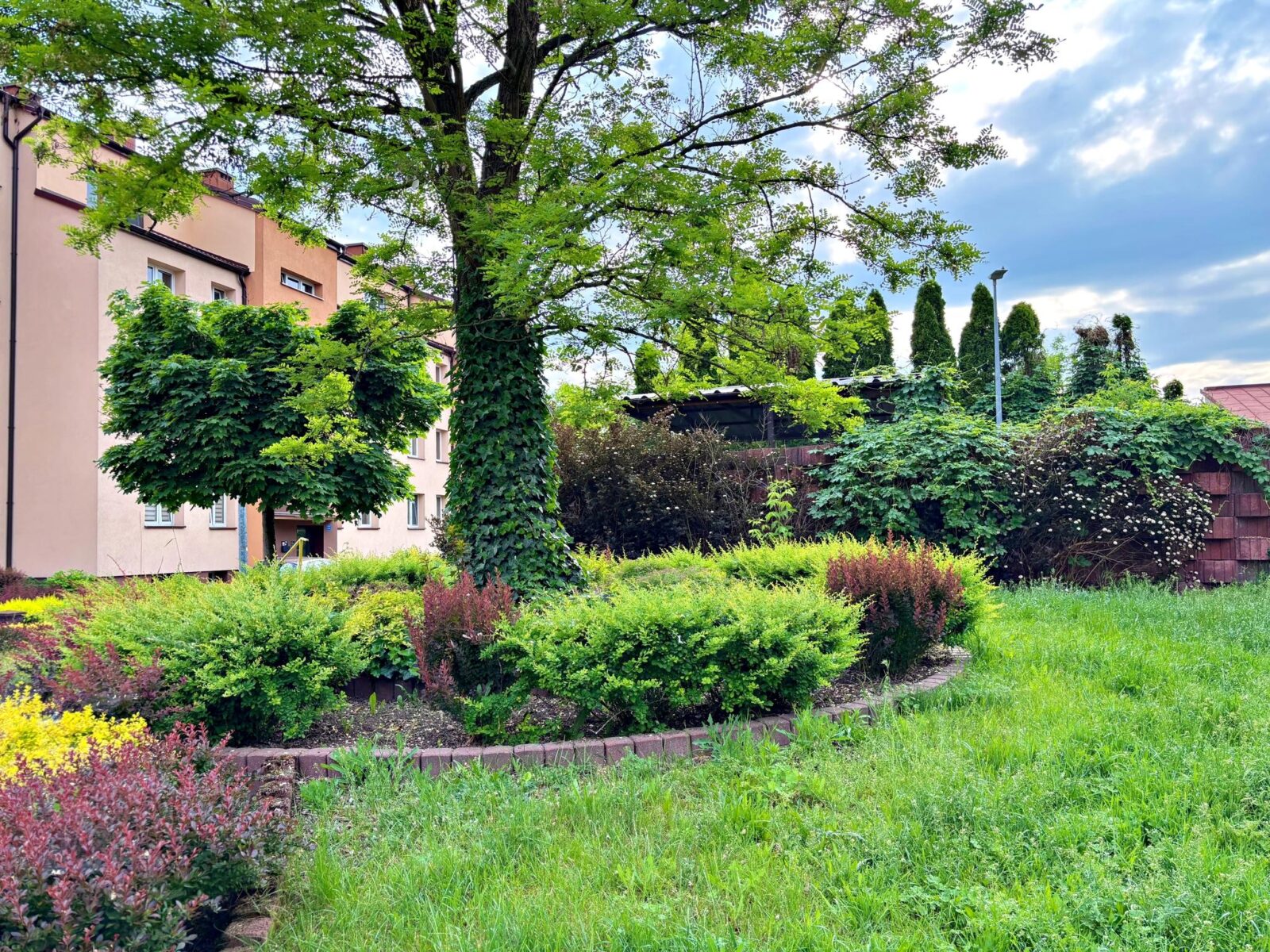 Osiedle z zadbaną zielenią wokół budynku oraz placem zabaw.