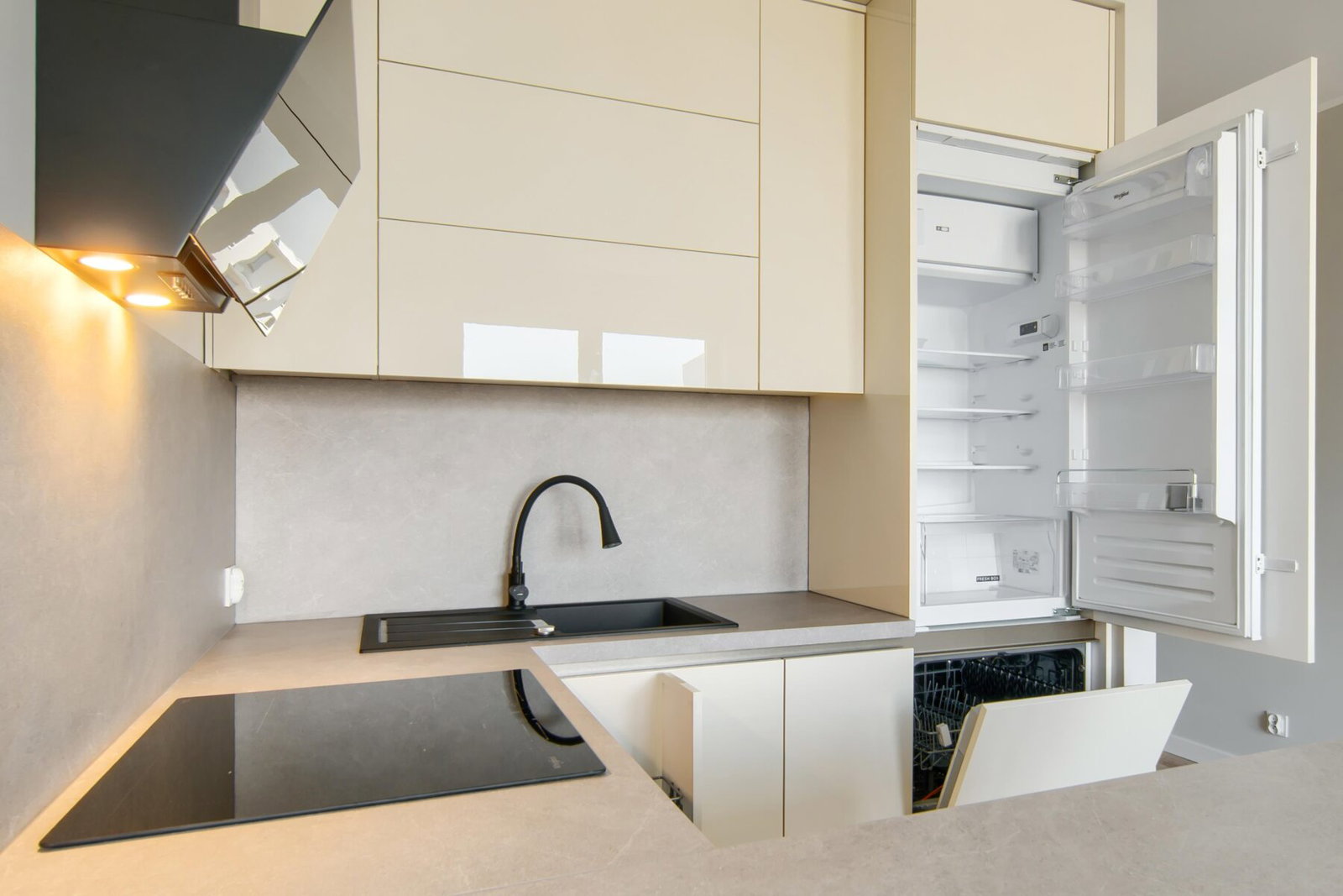 * Salon z aneksem kuchennym wyposażonym w zabudowę oraz sprzęty AGD (piekarnik, płyta, zmywarka, lodówka i pochłaniacz). Wszystkie sprzęty nowe i na gwarancji producenta.