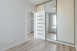 * Sypialnia z pojemną szafą w zabudowie z dużym lustrem.