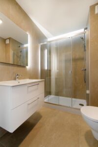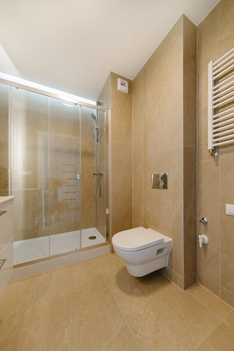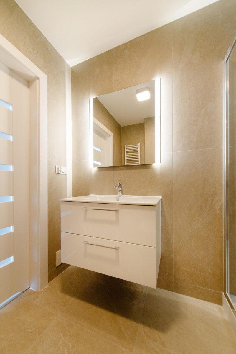* Łazienka z przestronnym prysznicem, armaturą Hansgrohe, szafką oraz podświetlanym lustrem. Dodatkowo w łazience zainstalowano ogrzewanie podłogowe!