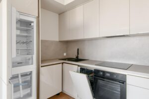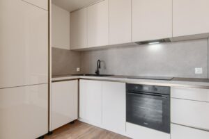 * Salon z aneksem kuchennym wyposażonym w zabudowę oraz sprzęty AGD (piekarnik, płyta, zmywarka, lodówka i pochłaniacz). Wszystkie sprzęty nowe i na gwarancji producenta.