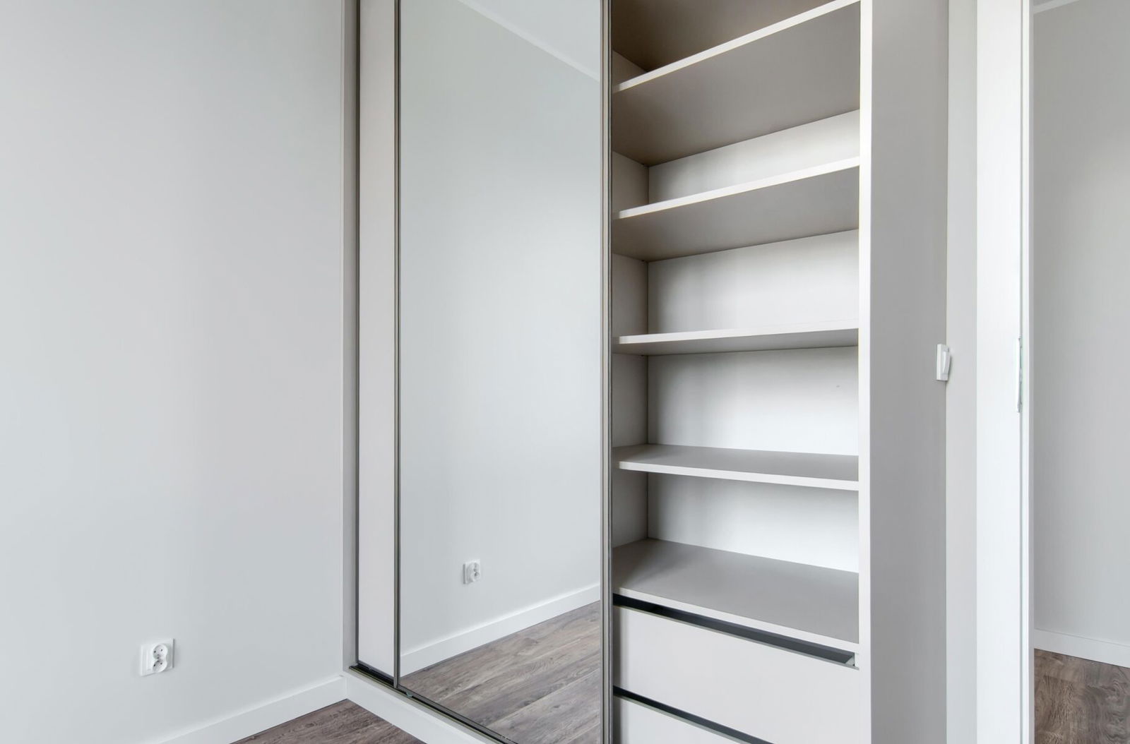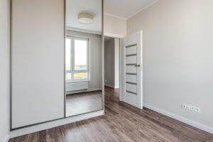 * Sypialnia z pojemną szafą w zabudowie z dużym lustrem.