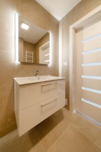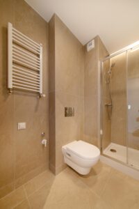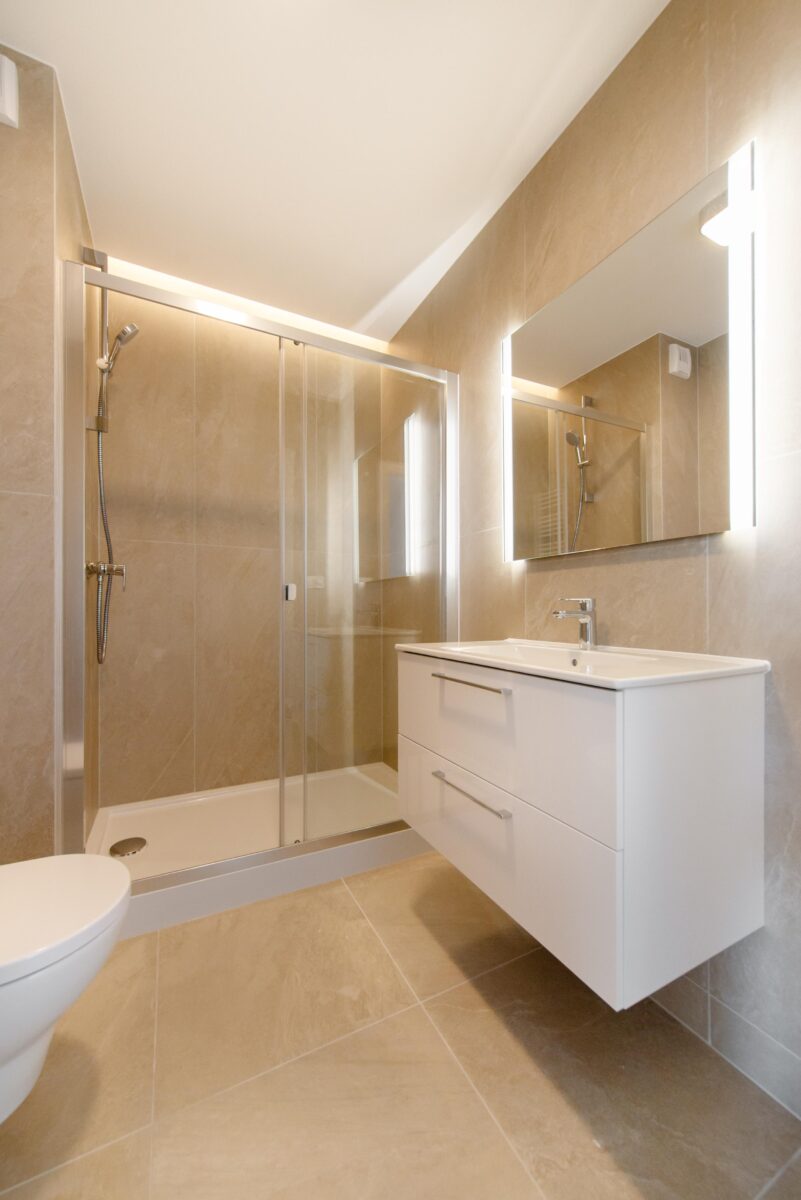 * Łazienka z przestronnym prysznicem, armaturą Hansgrohe, szafką oraz podświetlanym lustrem. Dodatkowo w łazience zainstalowano ogrzewanie podłogowe!