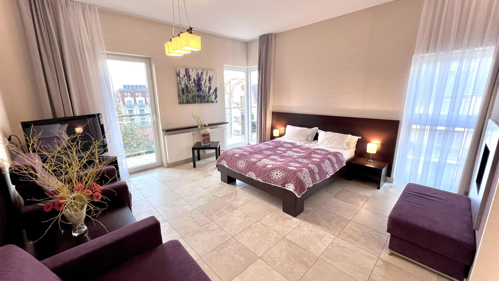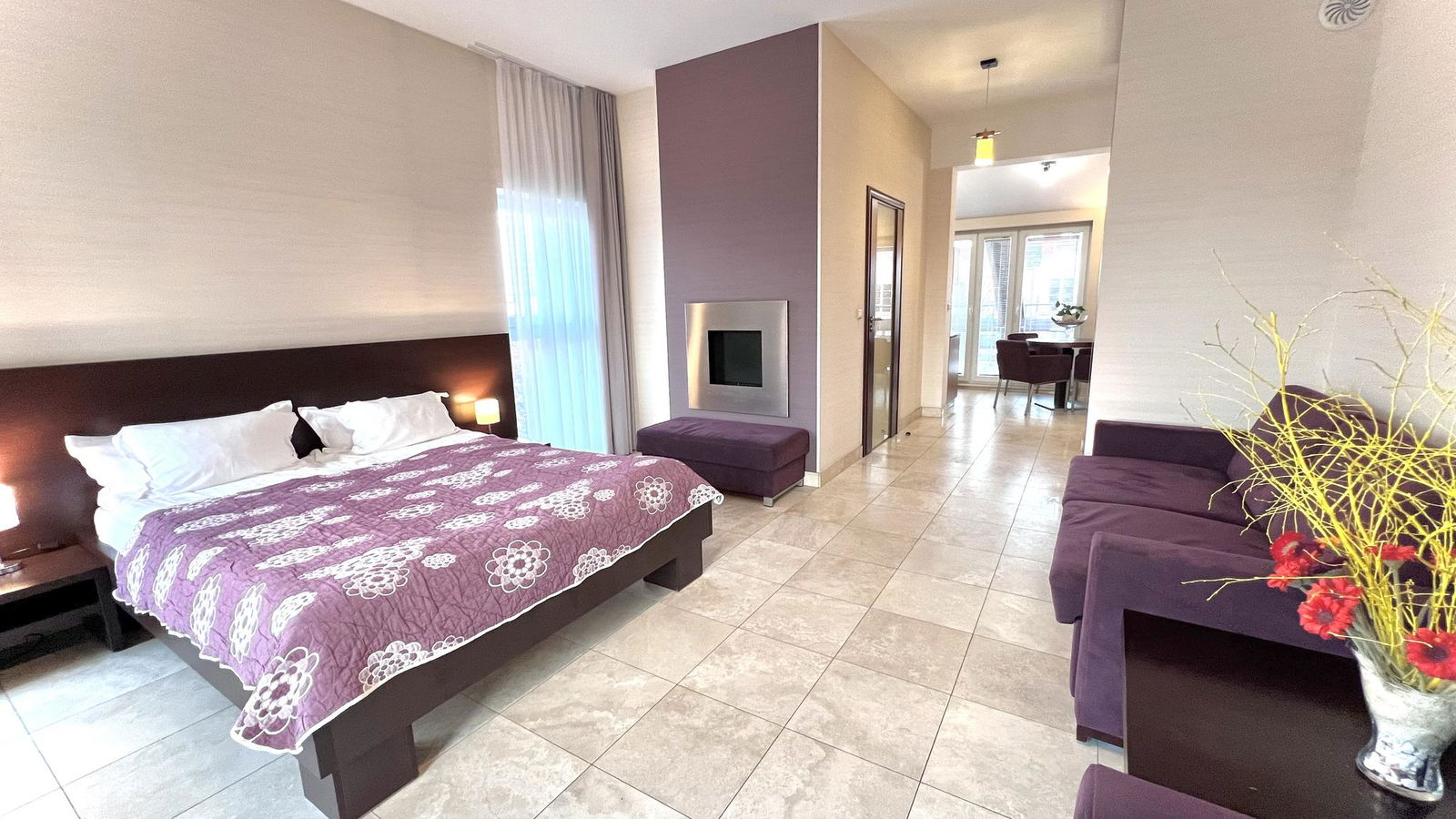 Apartament wykończony w eleganckim, hotelowym stylu, z dominującym materiałem, włoskiego trawertynu, znanym ze swojej trwałości i elegancji, używanym m.in. w Rzymskim Koloseum.