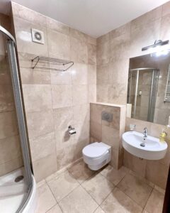 Apartament jest w bardzo dobrym stanie technicznym, wykończony w eleganckim, hotelowym stylu. Użyto trwałych materiałów, takich jak włoski trawertyn, co zapewnia jego długowieczność.