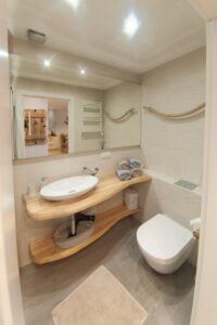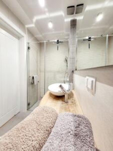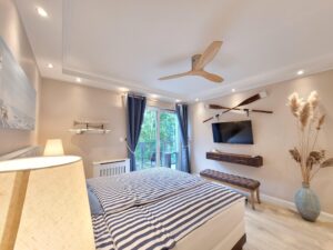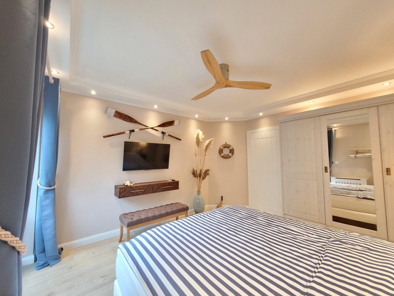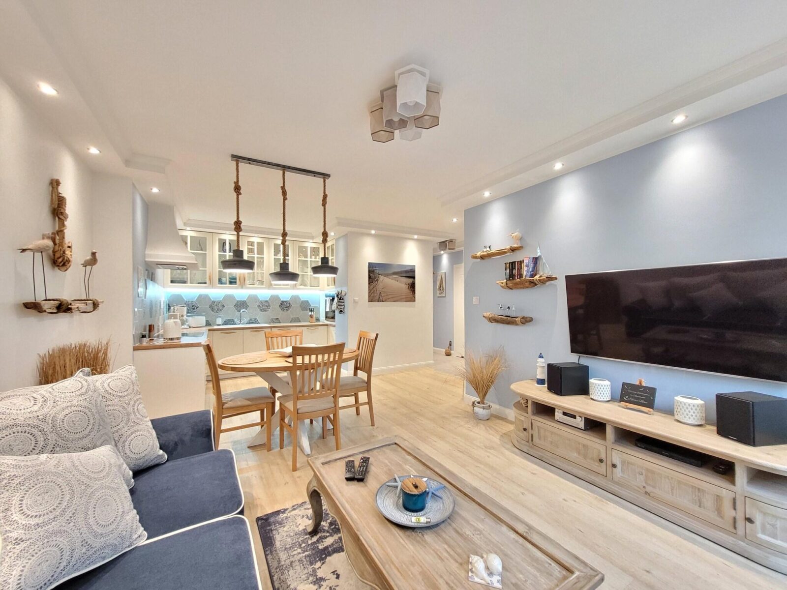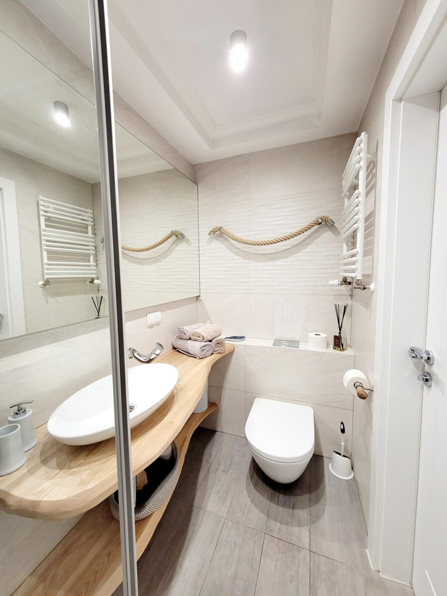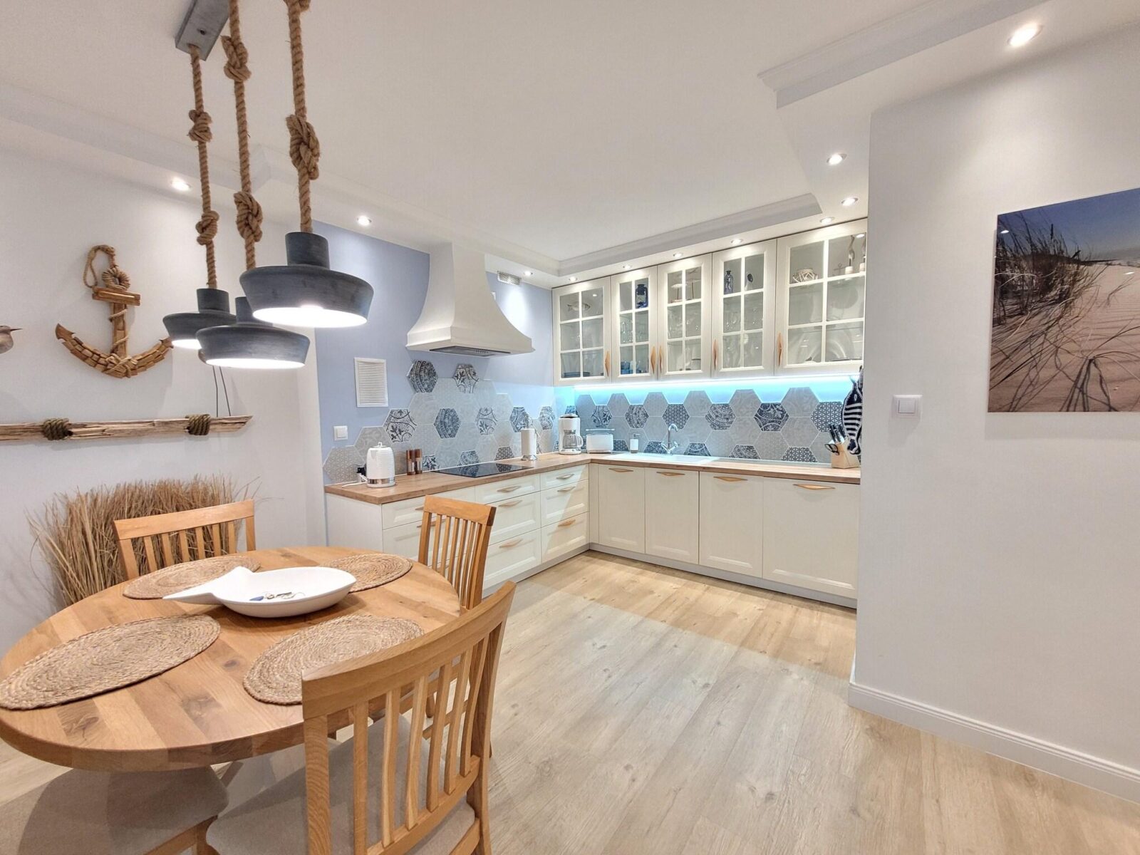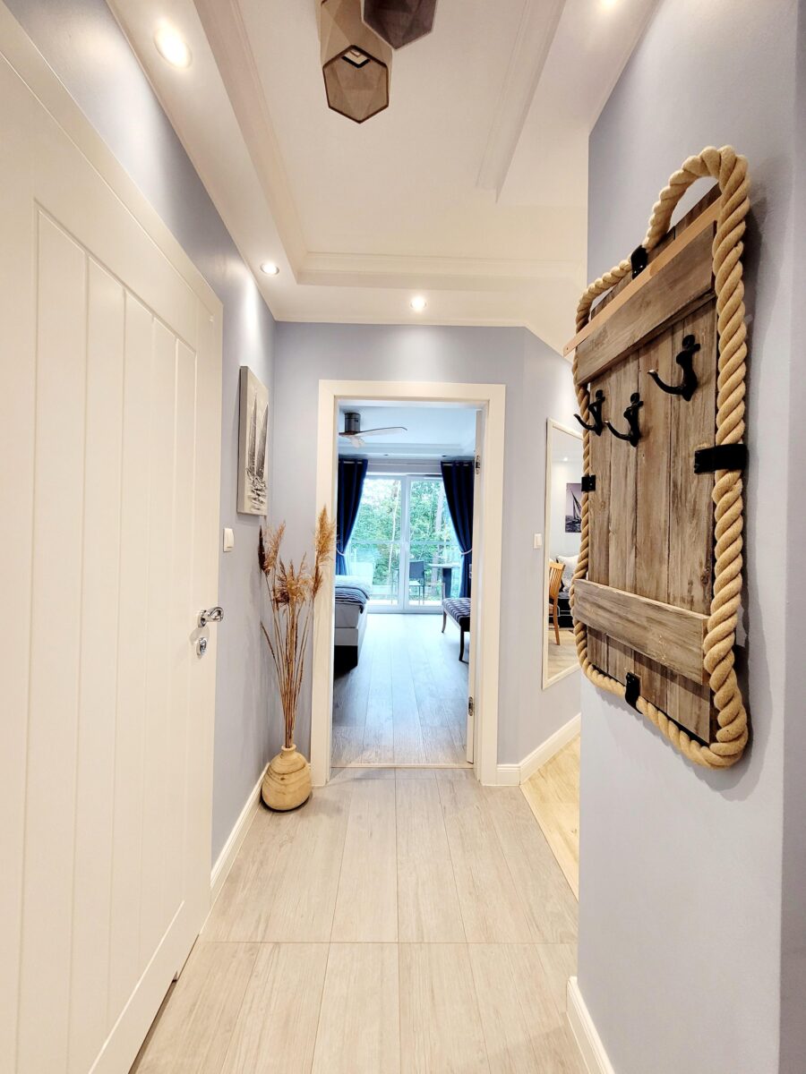 Apartament utrzymany jest w stylu marynistycznym – stonowana kolorystyka, naturalne materiały i detale inspirowane nadmorskim klimatem tworzą atmosferę lekkości, świeżości i komfortu.
