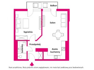 Układ: salon z aneksem kuchennym, sypialnia, łazienka, przedpokój