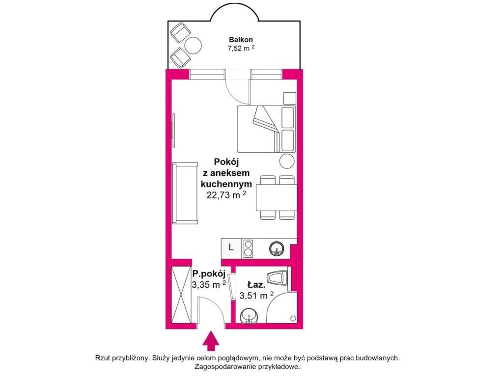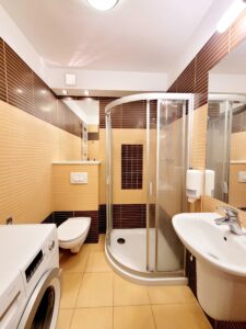 – Apartament o powierzchni 29,59 m² składa się z przestronnego salonu o powierzchni 22,73 m², w pełni umeblowanego, z aneksem kuchennym wyposażonym w płytę indukcyjną i lodówkę. Dodatkowo znajduje się tam przedpokój z pojemną szafą oraz jasna łazienka z kabiną prysznicową.