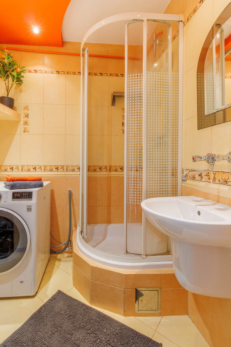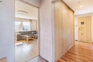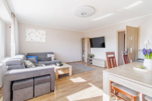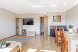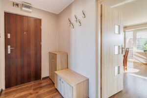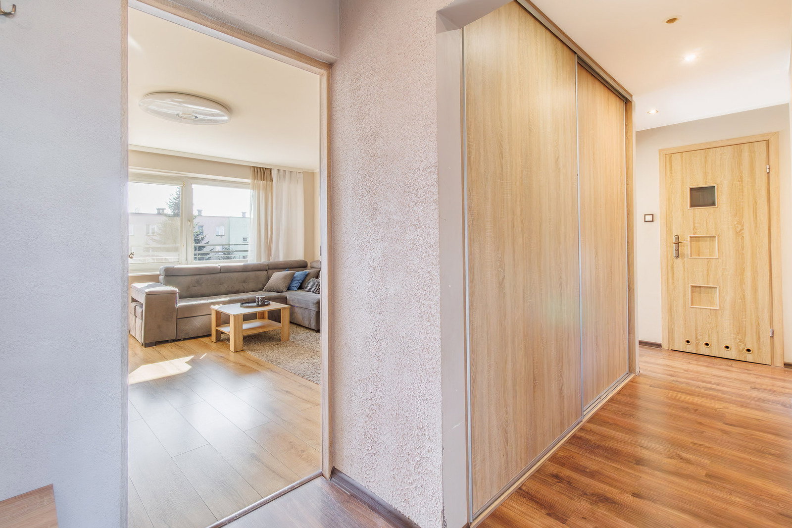 Wnętrze mieszkania było sukcesywnie modernizowane. Około 2013 roku w mieszkaniu wykonano wymianę instalacji elektrycznej oraz wymieniono instalację w łazience i wykonano jej remont, położono nowe panele w salonie, przedpokoju i pokoju dziecięcym oraz odświeżono ściany. Okna PCV (wymienione około 2012 roku) zapewniają dobrą izolację termiczną i akustyczną, a drewniane drzwi przeciwwłamaniowe zwiększają poczucie bezpieczeństwa. Kuchnia jest oddzielna i wyposażona została w kuchenkę gazową, lodówkę, zlew i funkcjonalne szafki, pozostawia przestrzeń na własną aranżację. W łazience znajdziemy prysznic, umywalkę oraz pralkę, a osobna toaleta usprawnia codzienne funkcjonowanie domowników.