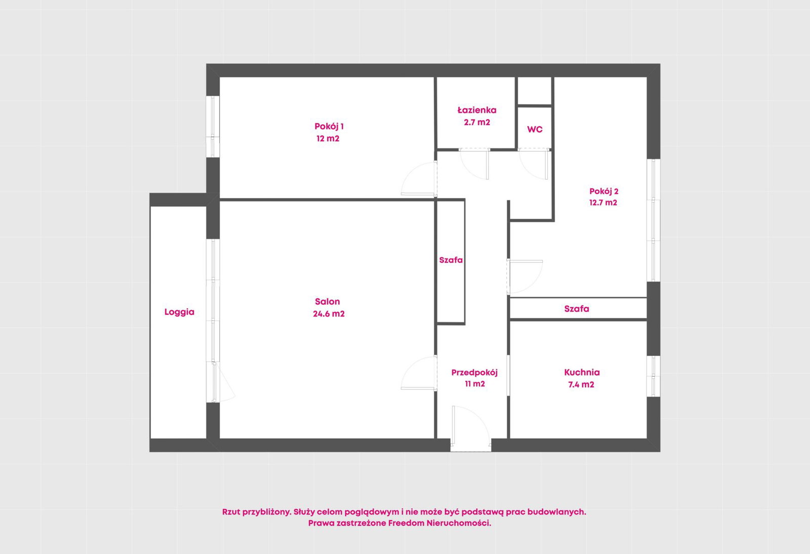 Mieszkanie ma powierzchnię 72,29 m² i składa się z trzech pokoi, w tym przestronnego salonu oraz dwóch ustawnych sypialni.