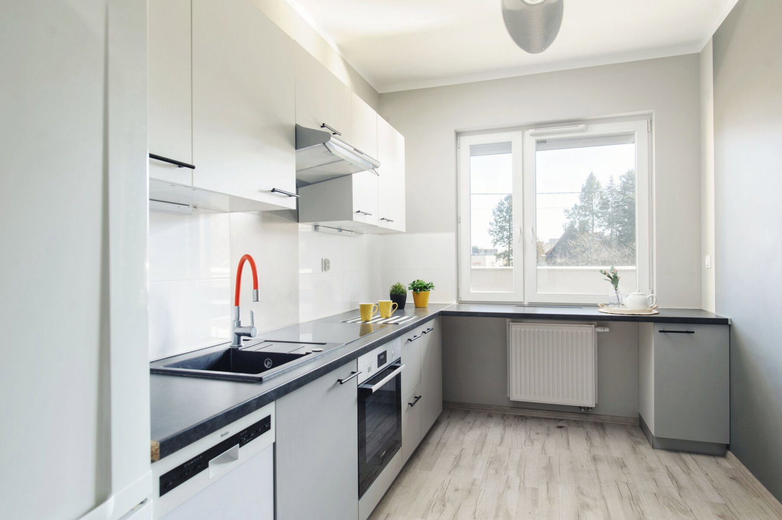 Kuchnia przestronna, widna, wyposażona w meble oraz sprzęt AGD, z widokiem na loggię i miasto.