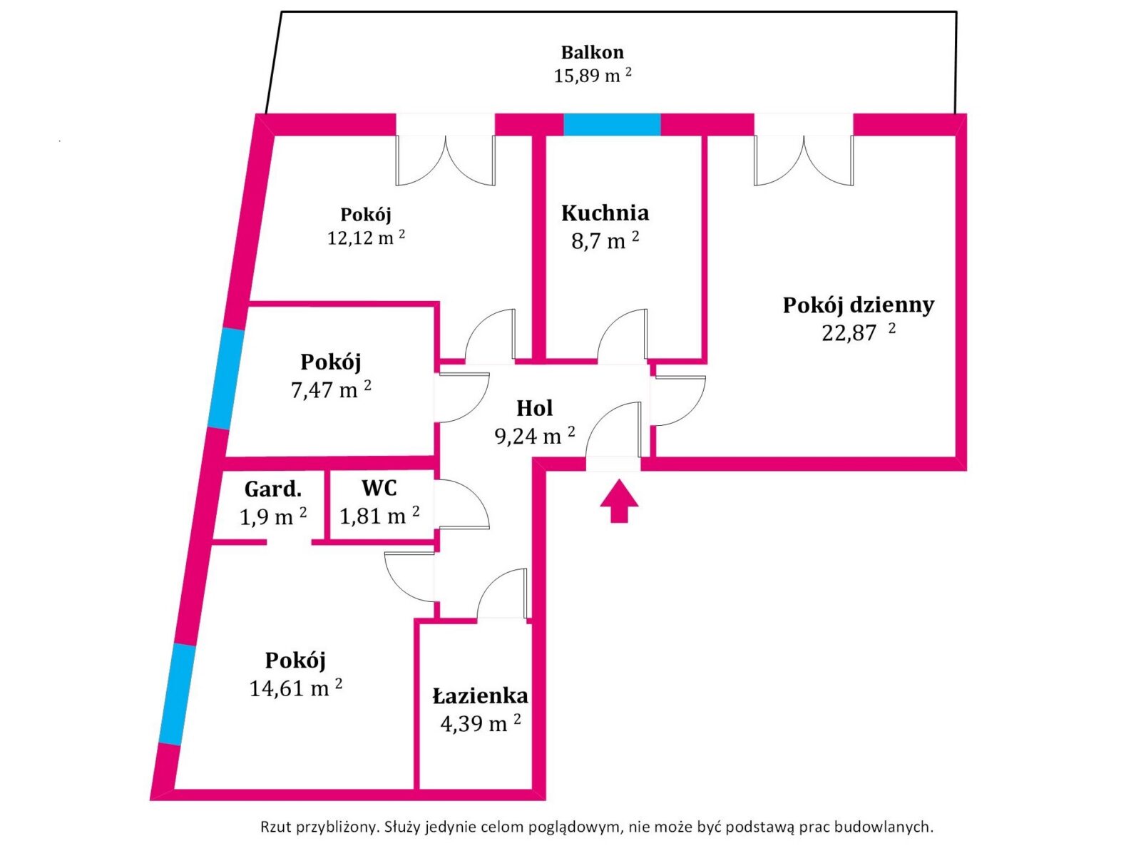 - Powierzchnie pokoi: 14,61 ; 7,47 ; 12,12 ;