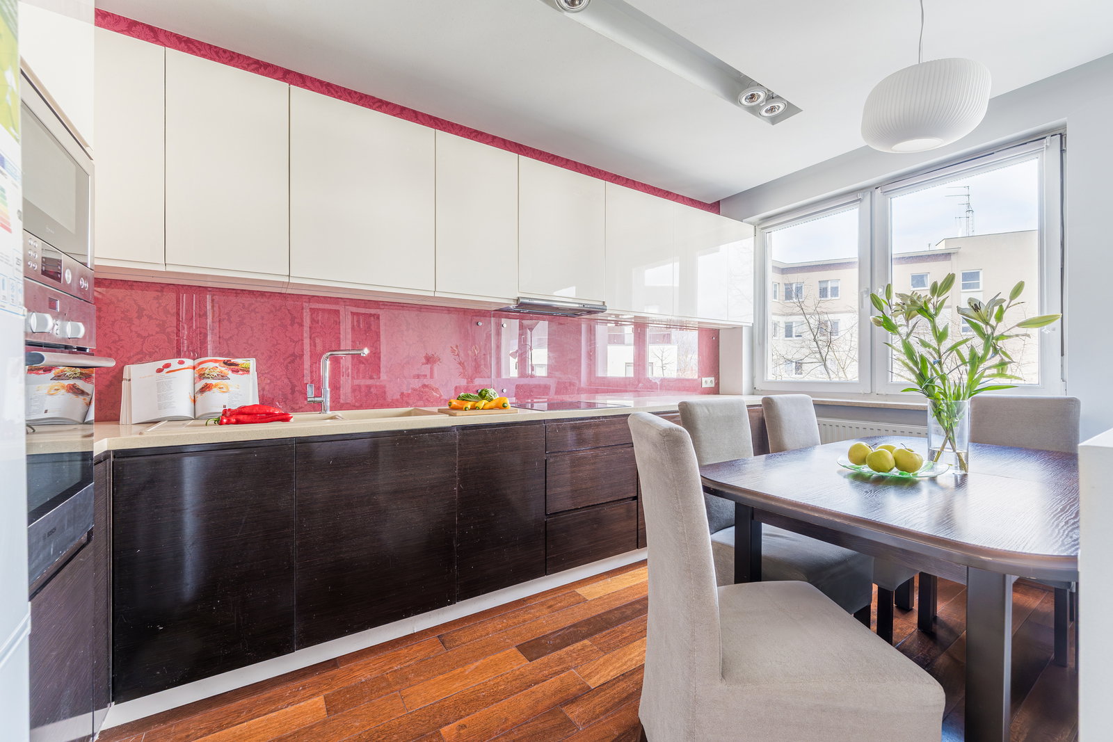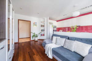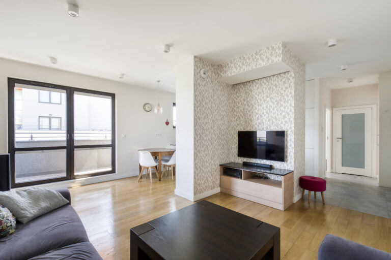 Mieszkanie wysokie na 263 cm, w pełni umeblowane i wyposażone (sprzęt AGD: lodówka, zamrażarka, zmywarka, płyta grzewcza, piekarnik, mikrofala, pochłaniacz, pralka).