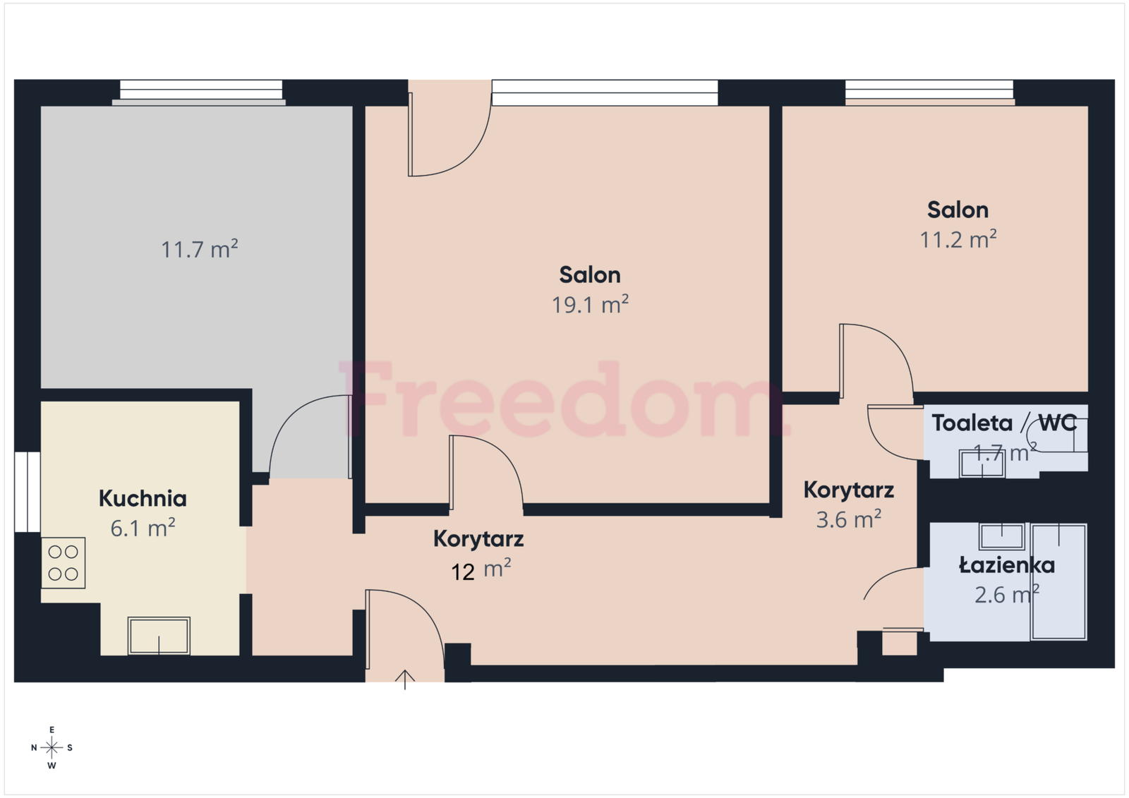 Mieszkanie ma przemyślany rozkład, składa się z trzech pokoi: przestronnego salonu (19,1 m²), drugiego pokoju (11,2 m²) idealnego na sypialnię lub pokój dziecięcy oraz trzeciego pokoju (11,7 m²), który można wykorzystać jako gabinet lub dodatkową sypialnię. Dodatkowo znajduje się oddzielna kuchnia (6,1 m²), osobna łazienka i toaleta oraz dwa przedpokoje.