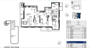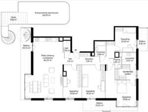 Mieszkanie składa się z pięciu pokoi, w tym przestronnego pokoju dziennego z aneksem kuchennym o powierzchni 46,29 m². Dodatkowo znajdują się cztery sypialnie o powierzchniach: 19,88 m², 18,02 m², 13,80 m² i 12,32 m². Do dyspozycji są także dwie łazienki, WC, hall, korytarz, garderoba oraz pralnia.