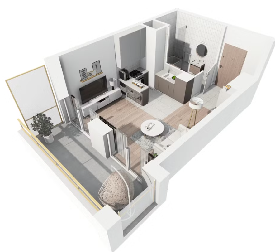 Mieszkanie ma powierzchnię 27,77 m² i składa się z jednego pokoju oraz aneksu kuchennego.