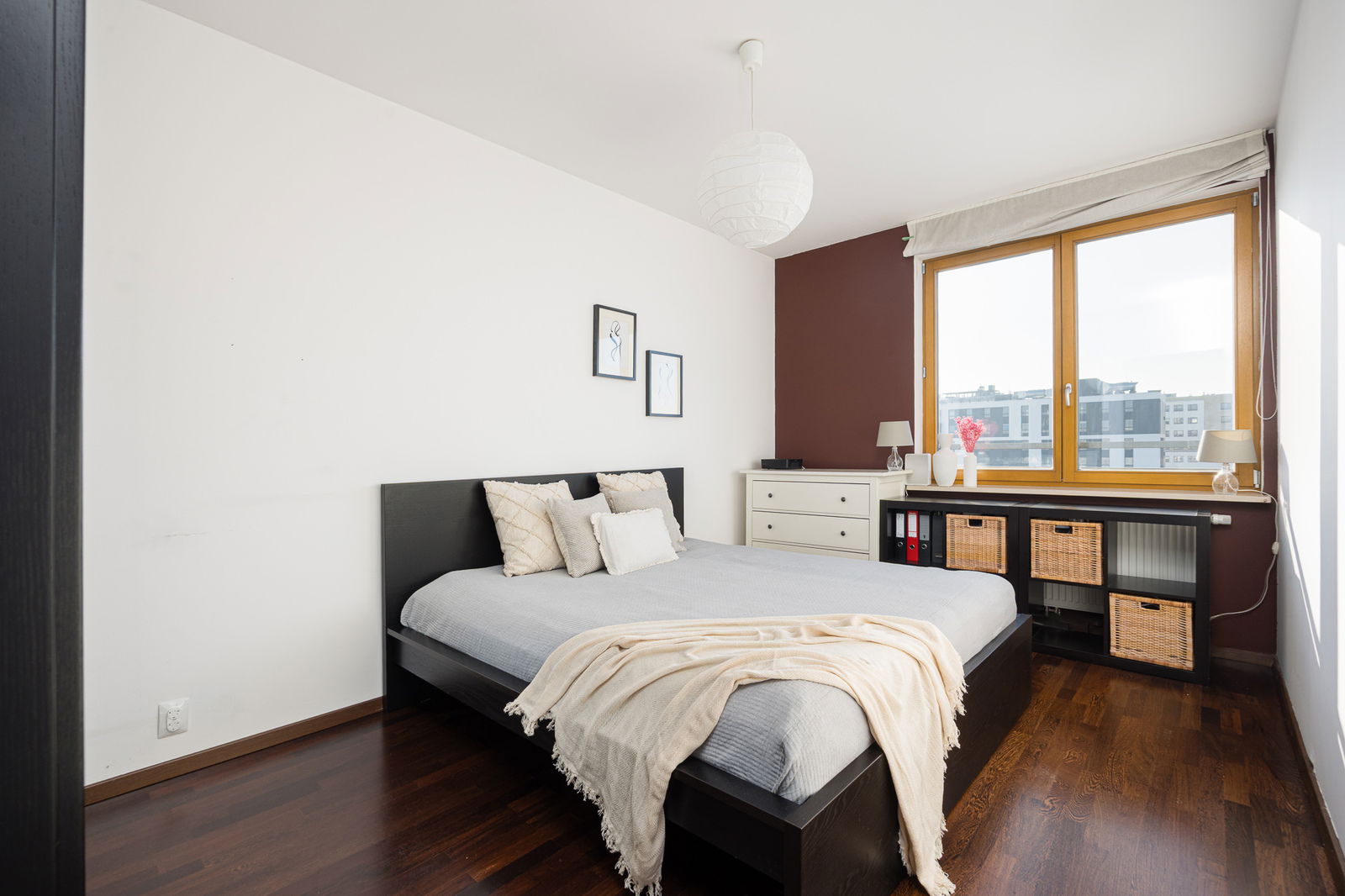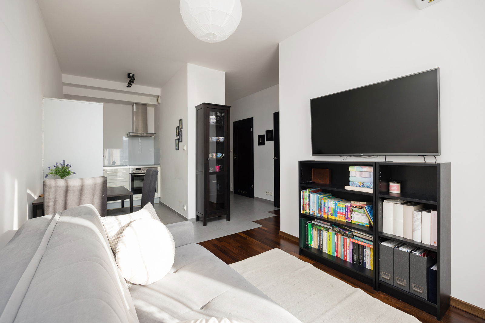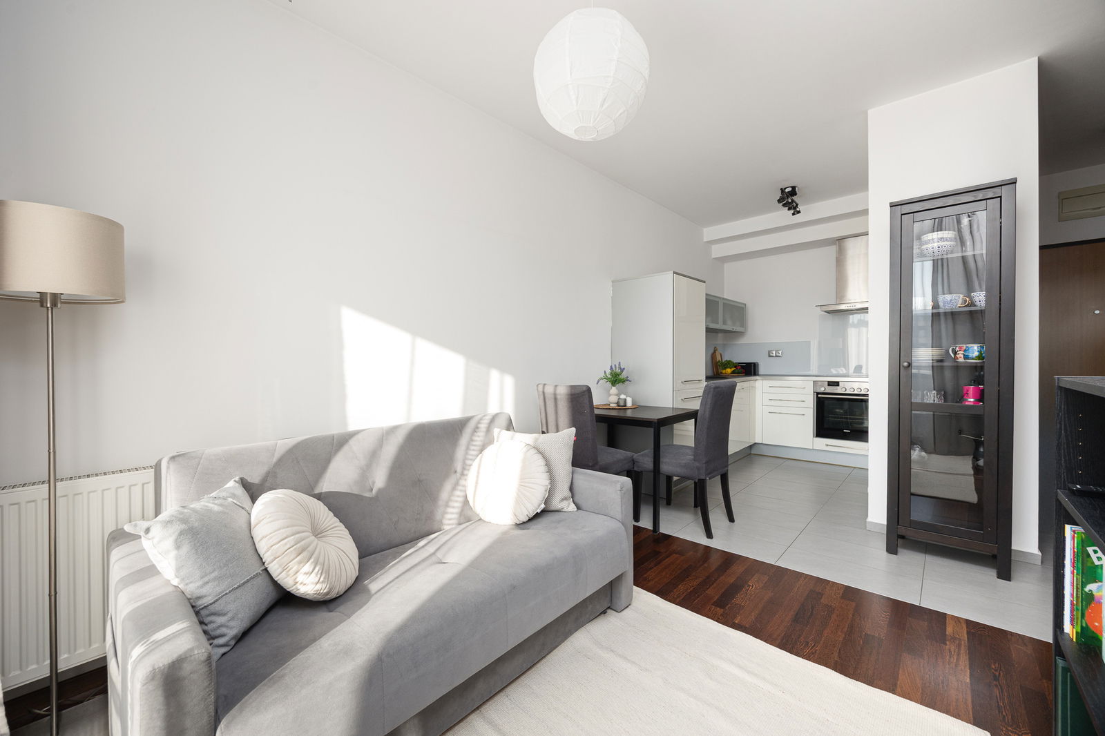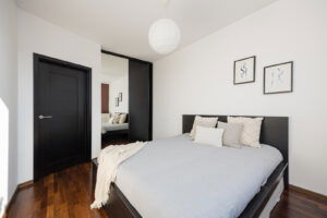 Wnętrze utrzymane jest w jasnej, ponadczasowej kolorystyce – meble w odcieniu szarości i brązu, które tworzą spójną całość. Przemyślany układ pomieszczeń zapewnia komfort codziennego życia. Dobrze doświetlone pomieszczenia od strony południowej.