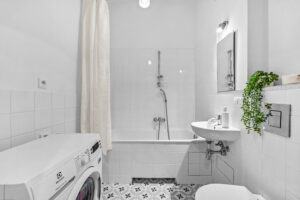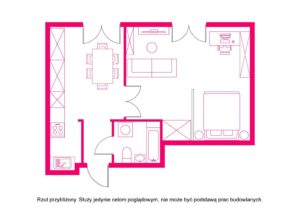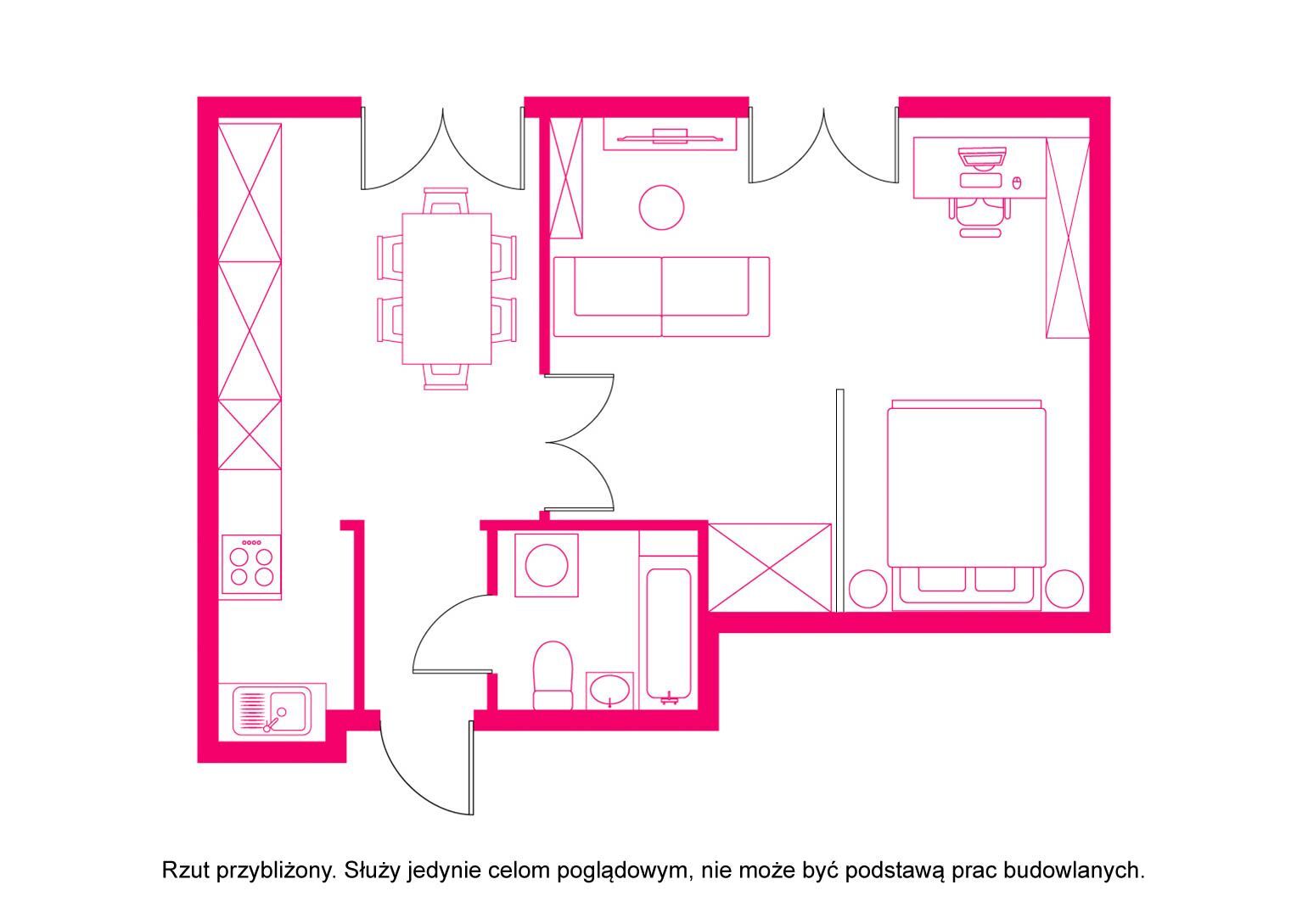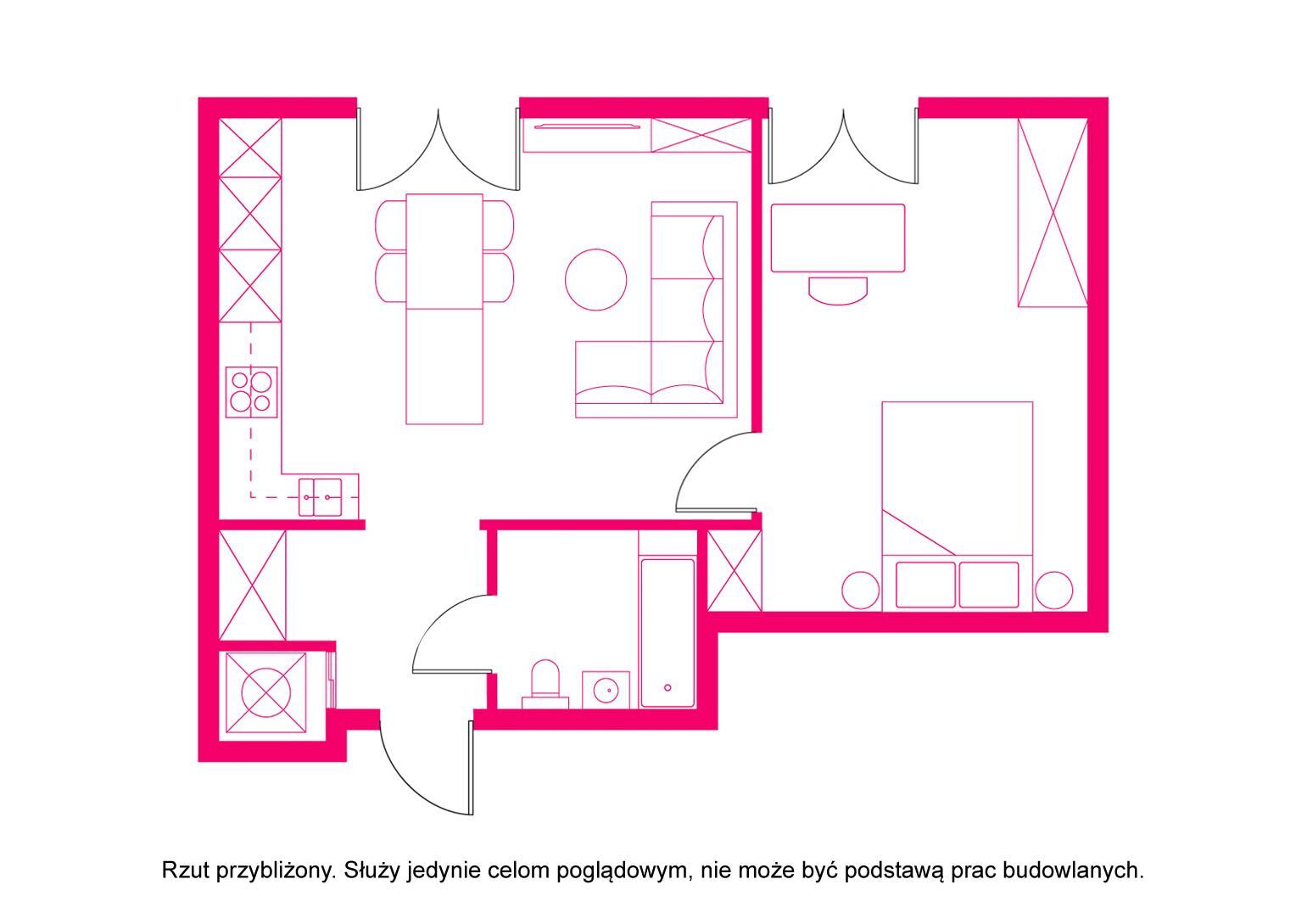Mieszkanie ma funkcjonalny układ amfiladowy, składający się z przestronnego salonu o powierzchni 23 m² oraz jadalni z aneksem kuchennym o powierzchni 15 m². Dodatkowo znajduje się łazienka z wanną i miejscem na pralkę.