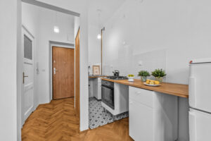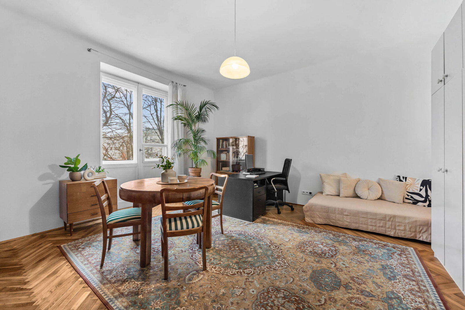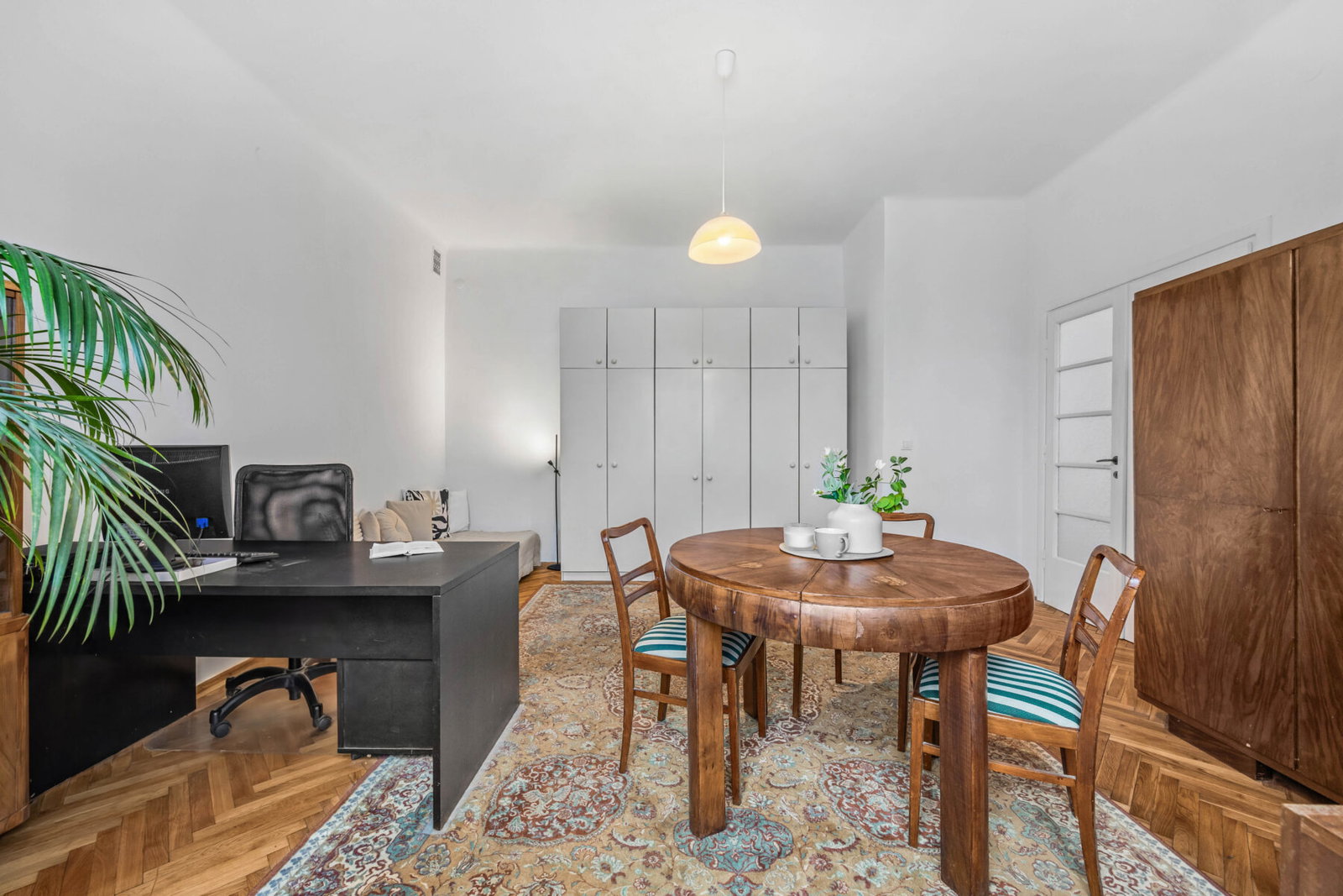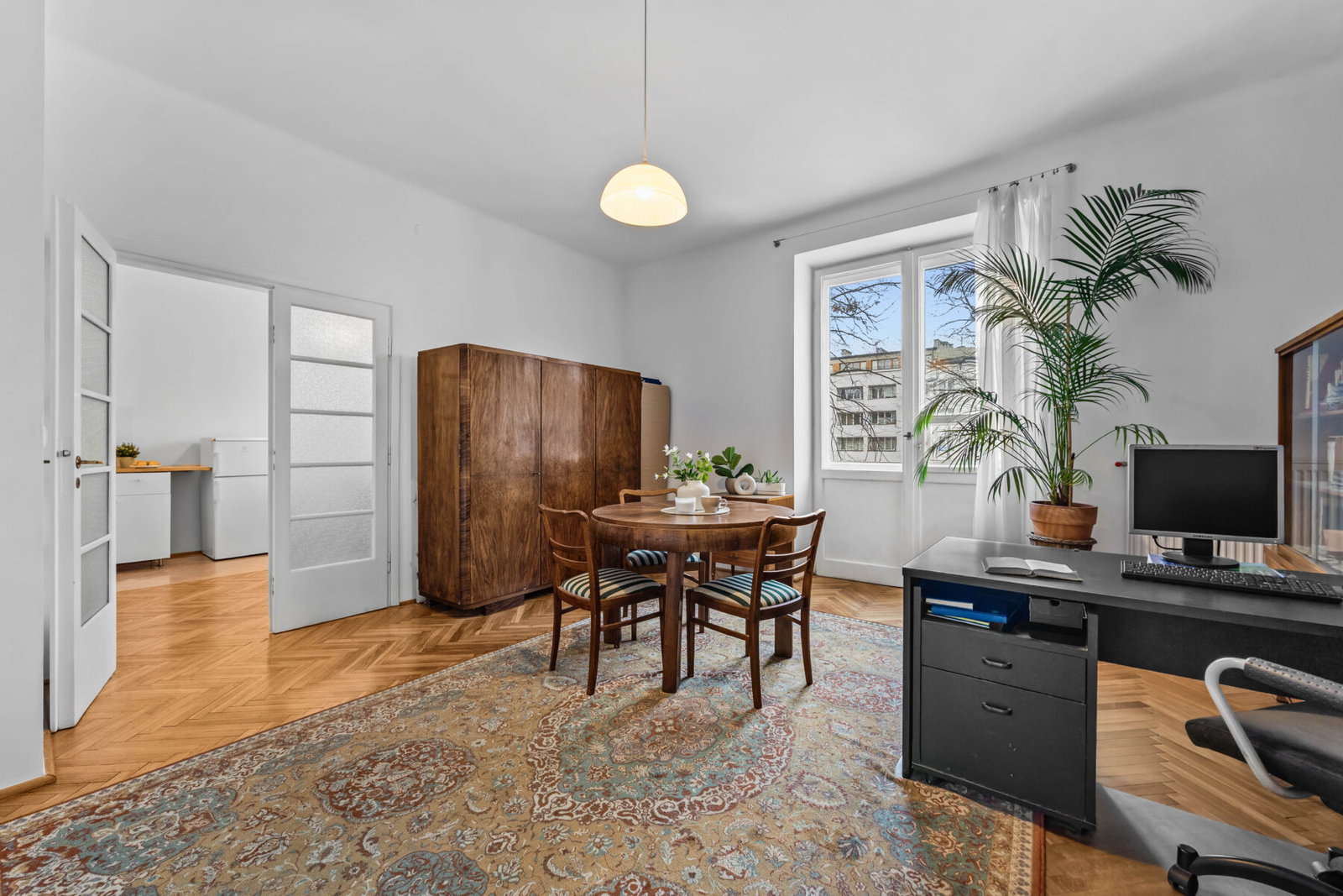 Naturalne światło pięknie podkreśla wysokość pomieszczeń i klasyczny charakter wnętrza. To idealna propozycja dla osób, które cenią przedwojenną architekturę i ponadczasowy styl.