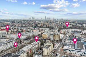 Mieszkanie znajduje się w sercu Starego Mokotowa, w pobliżu Parku Królikarnia, Parku Dreszera oraz Parku Morskie Oko. W okolicy są liczne restauracje, kawiarnie, sklepy oraz przystanki tramwajowe i autobusowe, co zapewnia doskonałą komunikację.
